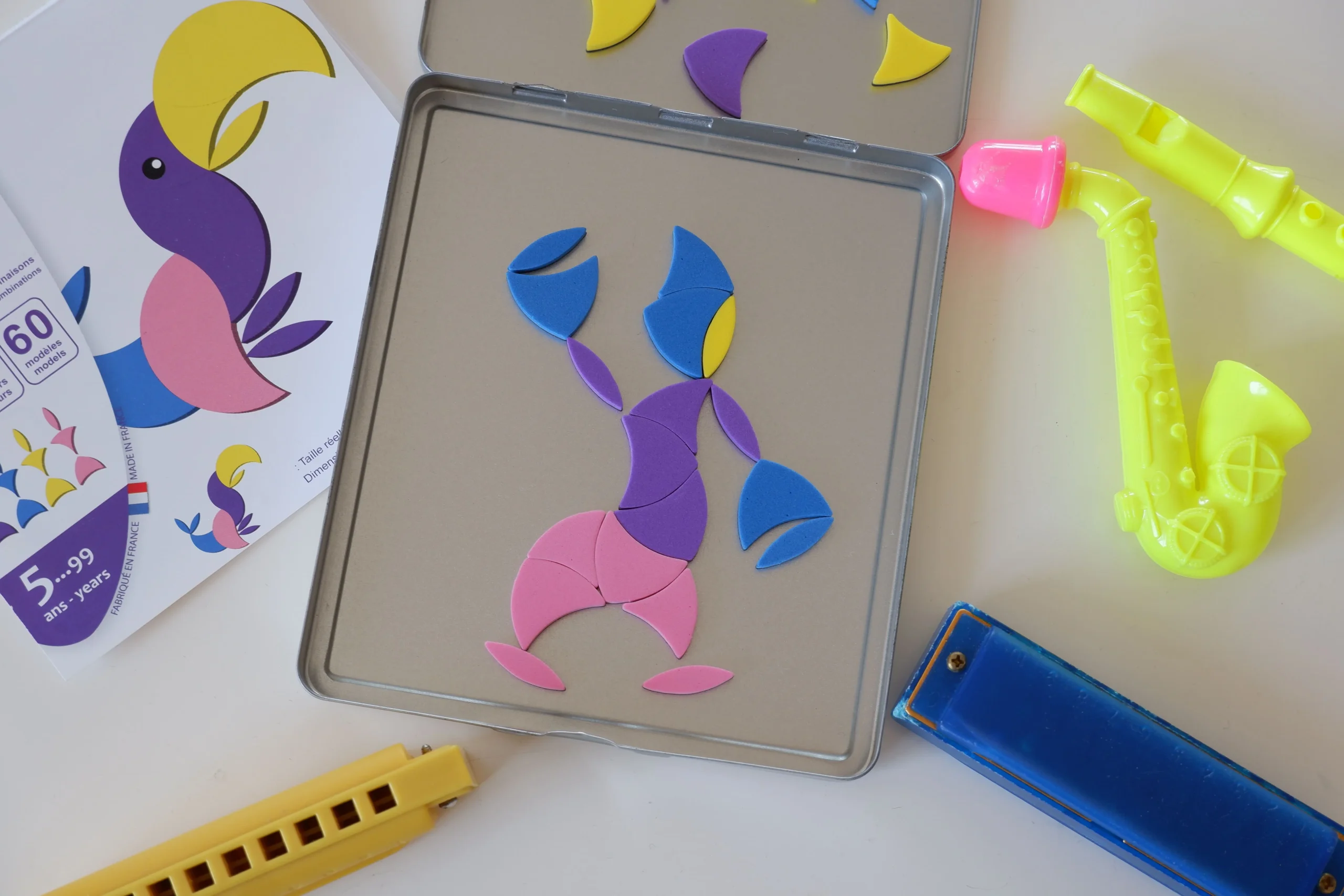Composition : 40 magnets en mousse (2cm), 4 couleurs, 60 modèles à reproduire