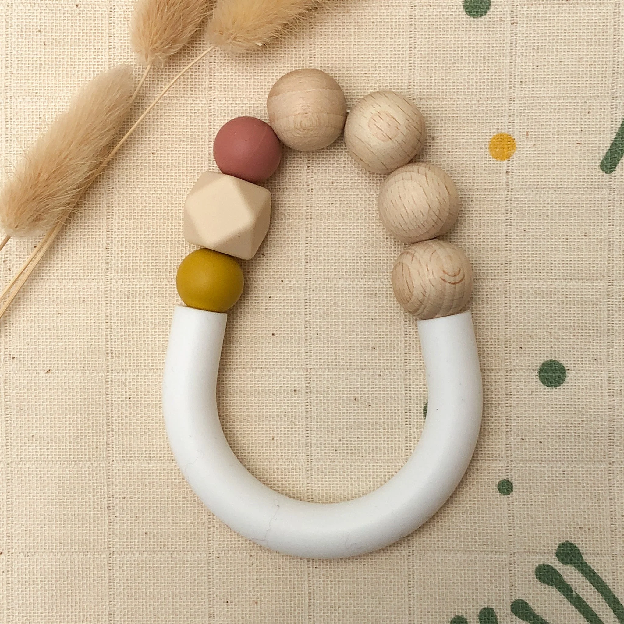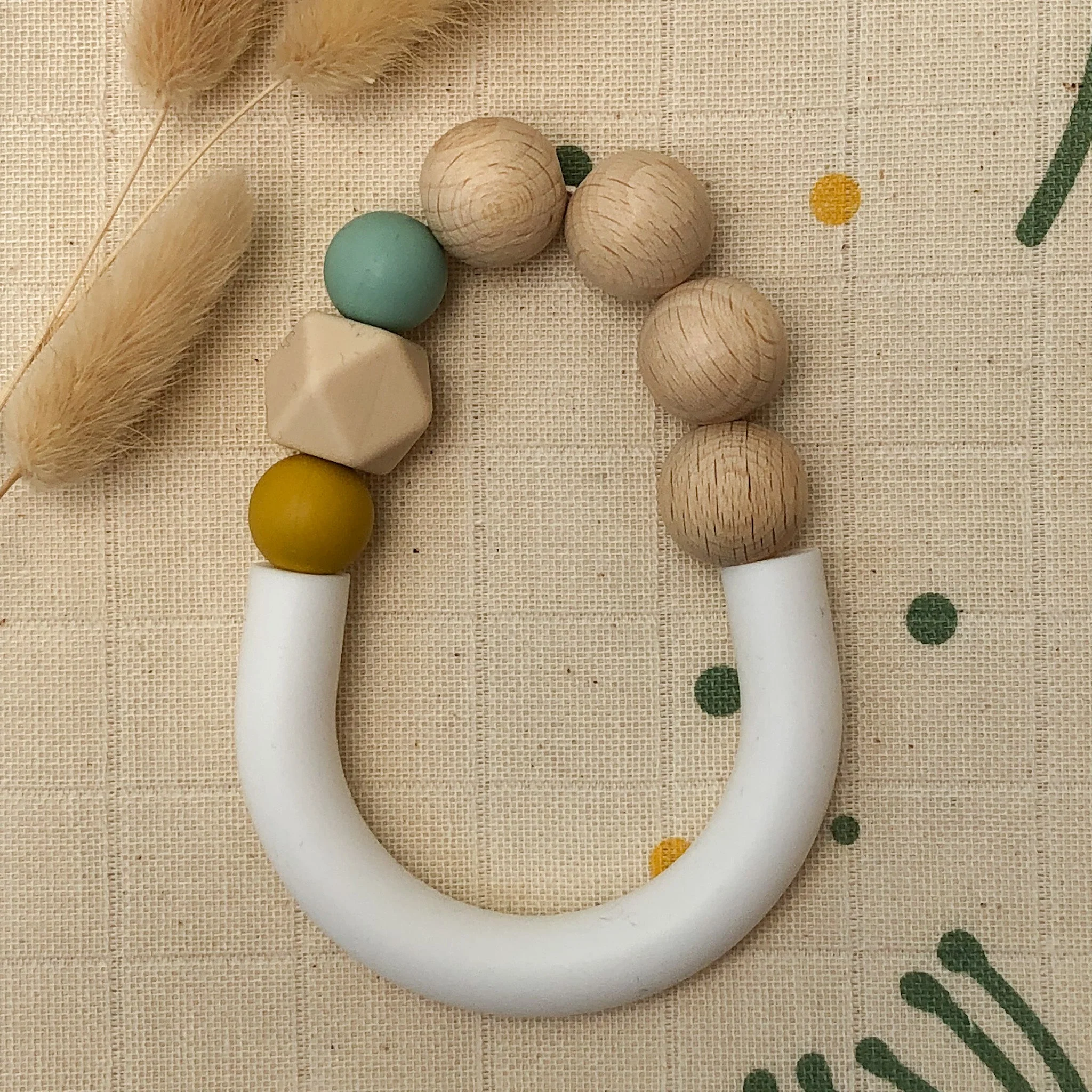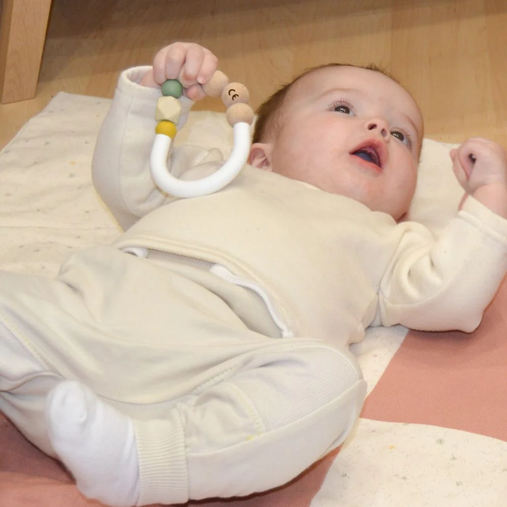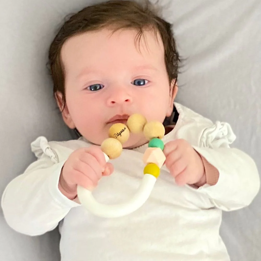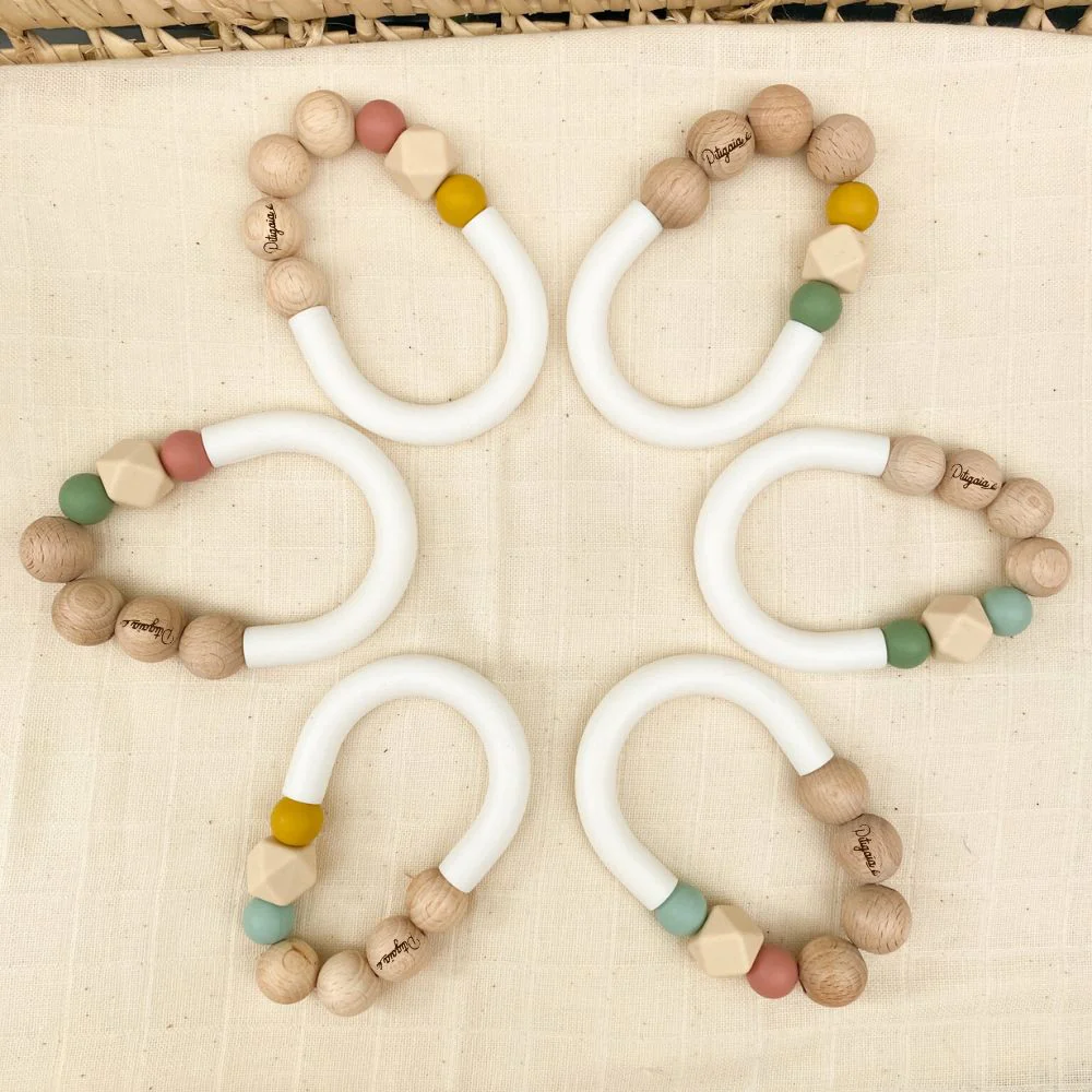 Son anneau en bois non traité associé aux perles de silicone alimentaire toutes douces lui permettront de masser ses gencives en toute sécurité. La diversité des matières et des formes participeront également à l’éveil des sens de bébé.