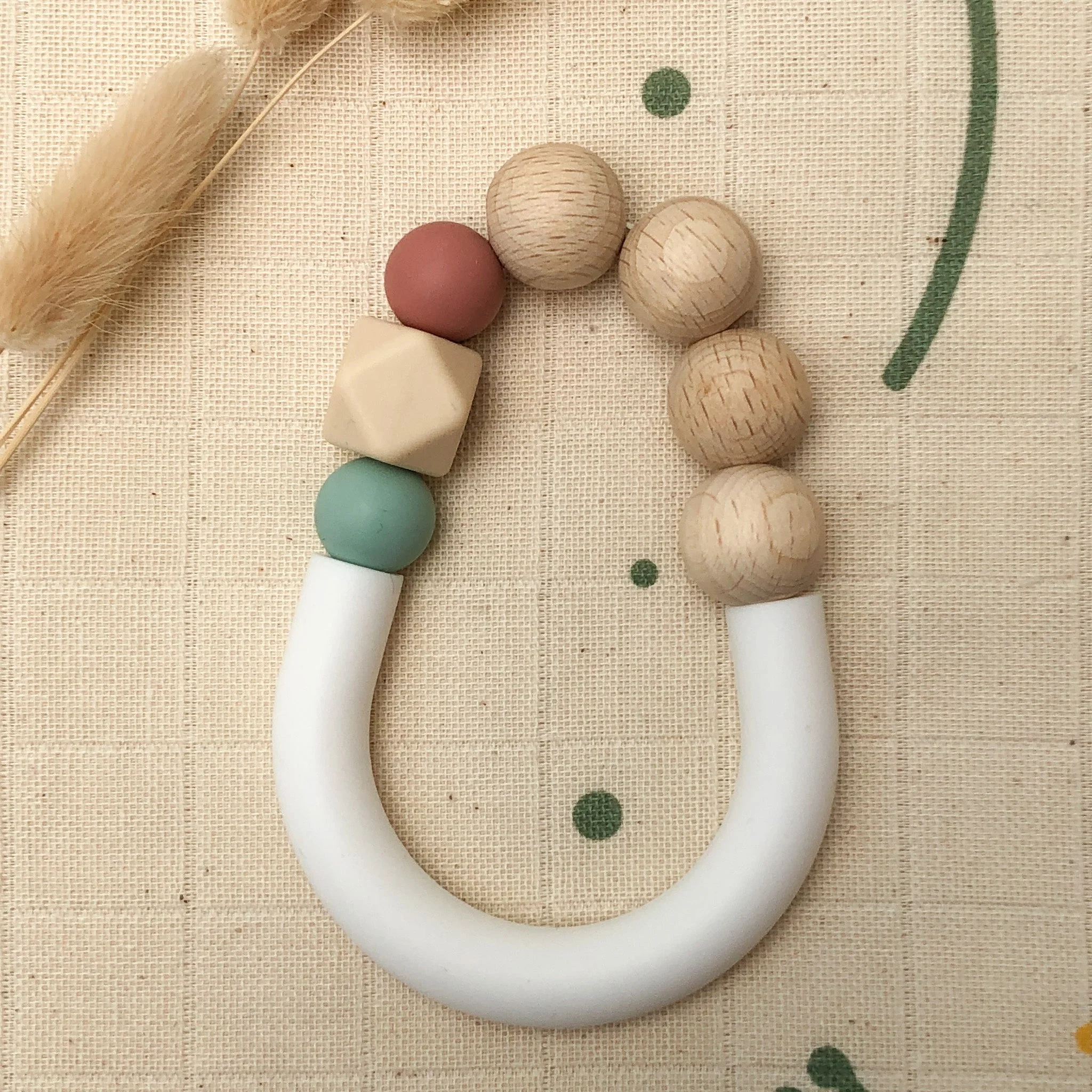 Composition : perles en silicone testées en laboratoire français, bois de hêtre naturel et non traité, issu de forêts durablement gérées et contrôlées.