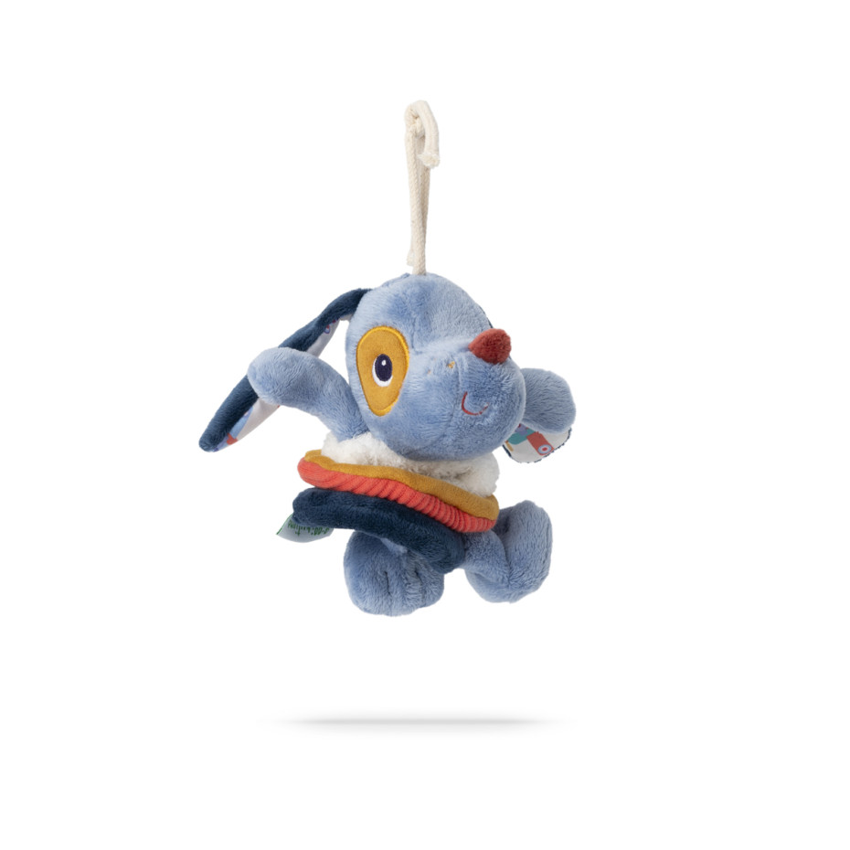 Jules bondit de joie ! Ce hochet vibrant à suspendre sera le nouveau jouet favori de bébé, dès ses 6 mois. Lorsqu’on tire sur les pattes du chien en peluche, il se trémousse joyeusement ! Une sensation rigolote et étonnante pour stimuler les sens des petits. Vous pouvez facilement suspendre ce jouet d’activités Lilliputiens à l’arche d’éveil, au cosy ou encore aux barreaux du lit de bébé pour le divertir en douceur. Cette peluche vibrante se compose de diverses matières, du plus lisse au duveteux, en passant par le rainuré ; mais aussi d’un imprimé avion dans les oreilles. Jules est un chien qui aime s’élancer dans les airs pour faire le show pour ses copains ! Tous sont fous de son avion, mais aussi de ses longues oreilles trop rigolotes. Avec ce charmant jouet d’éveil, vous êtes assuré d’offrir un cadeau de naissance stimulant au service de l’éveil de bébé. Les matières invitent au toucher, les couleurs captent le regard et attisent la curiosité, tandis que la fonction vibrante amusera bébé à l’infini ! En grandissant, il prendra plaisir à se saisir de la peluche pour la faire danser lui-même. Ce hochet en peluche bleu mesure 14×14 cm, il est lavable en surface uniquement. Alors, prêts à sautiller avec Jules ?