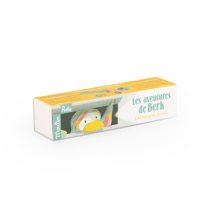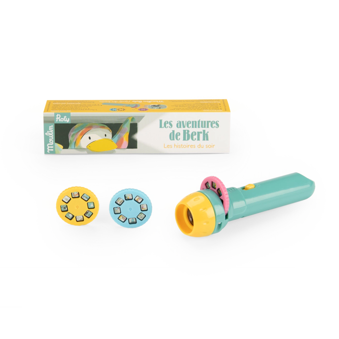 Lampe torche de poche où chacun des 3 disques projetés sur le mur raconte les aventures de Berk, le petit canard intrépide et maladroit. En collaboration avec la maison d’édition jeunesse Ecole des loisirs. Auteur & illustrateur : Julien Béziat