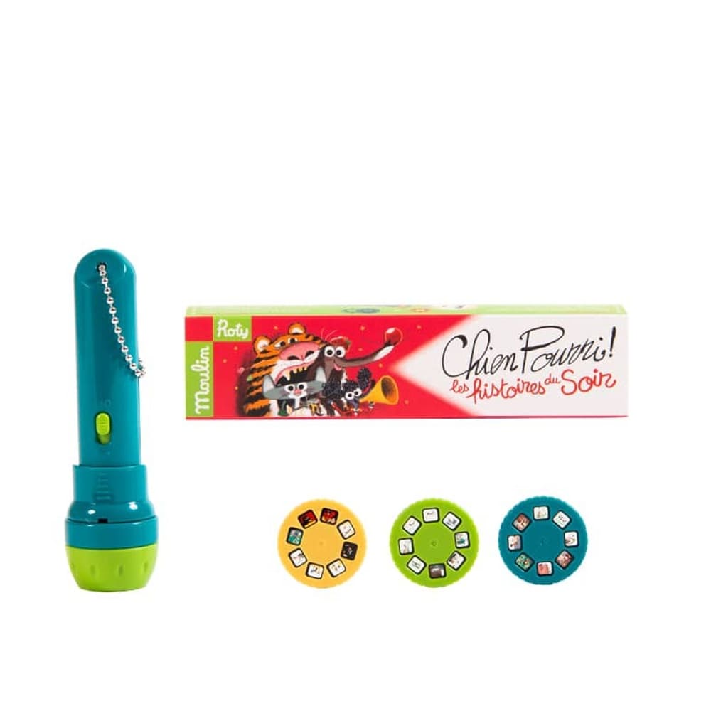 Lampe torche de poche où chacun des 3 disques projetés sur le mur raconte les aventures délirantes de Chien pourri, héros farceur de l’école des loisirs. Les illustrations colorées embarquent l’enfant dans un monde imaginaire où il y a tout à inventer !