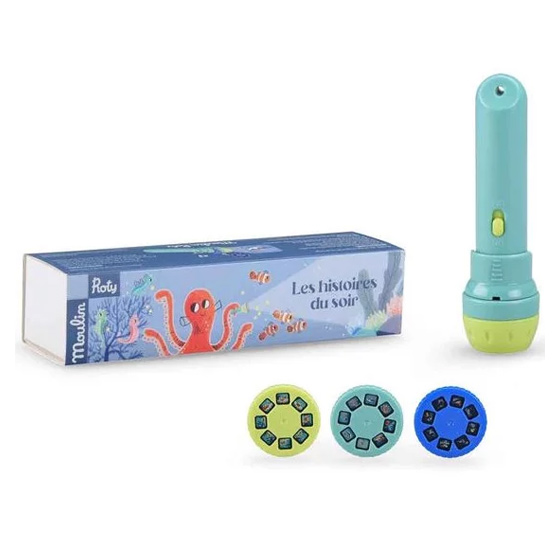 Découvrez la lampe à histoires de la collection Les aventures de Paulie de Moulin Roty, une lampe torche qui projette des images en couleurs pour raconter de jolies histoires à votre enfant.