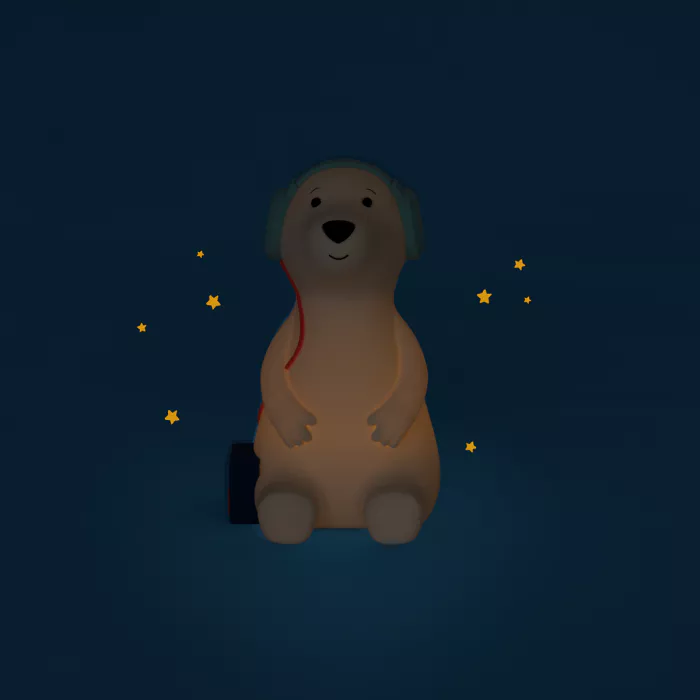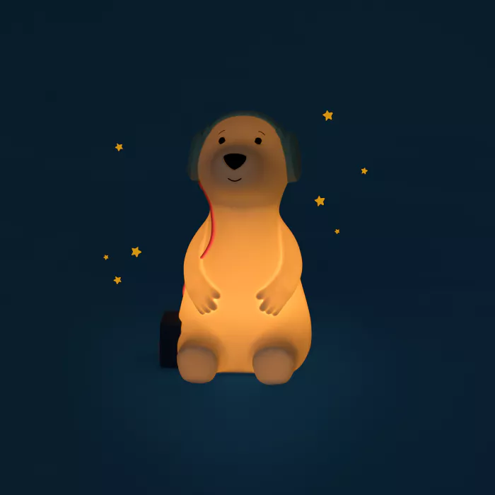 Lampe veilleuse chien en silicone sans BPA avec variateur (3 intensités). Diffuse une lumière rassurante dans la chambre de bébé une fois la nuit tombée et décore joliment la chambre durant la journée ! Module LED amovible. Câble USB-C fourni.