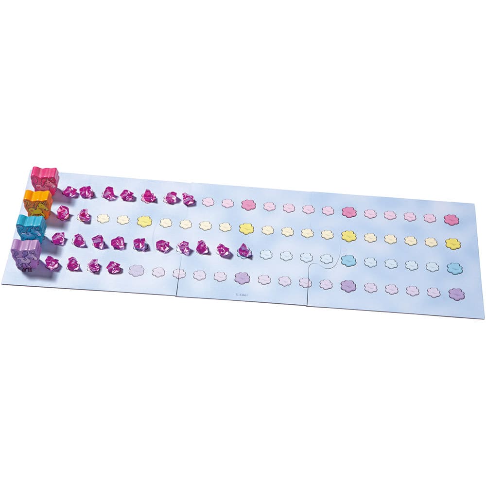 Contenu: 1 plateau de jeu, 1 licorne rose Bonheur étincellant, 1 licorne jaune Poussière d’étoile, 1 licorne violette Fleur magique, 1 licorne turquoise Tourbillon magique, 60 cristaux de nuage, 1 dé en cristal rose, 1 dé nuage bleu, 1 règle du jeu.
