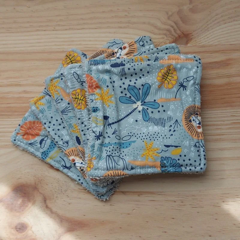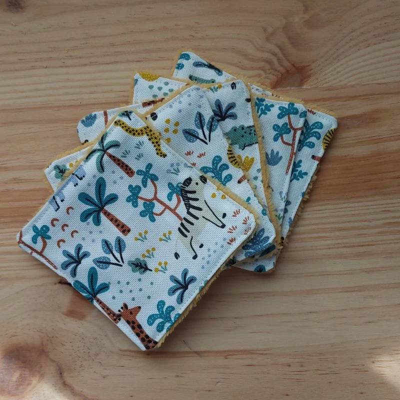 | Lingettes réutilisables | Bambou Gris Fleurs, Bambou Moutarde Safari, Coton Gris Lions |