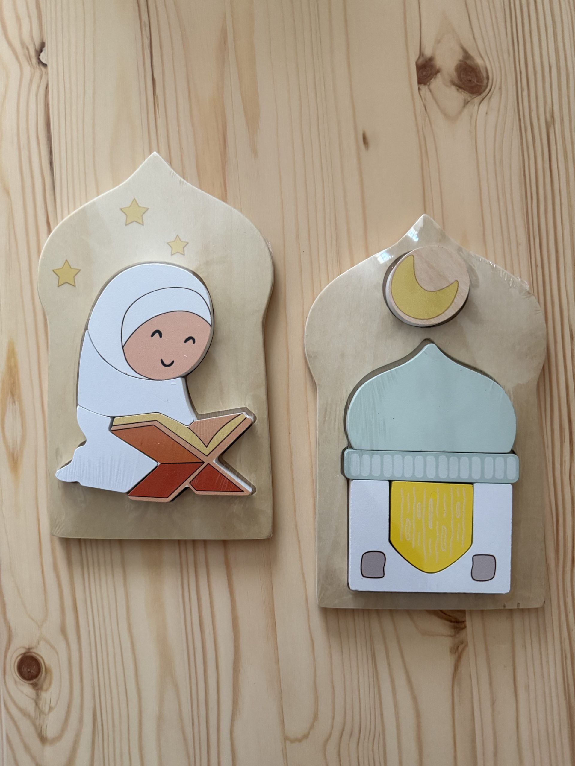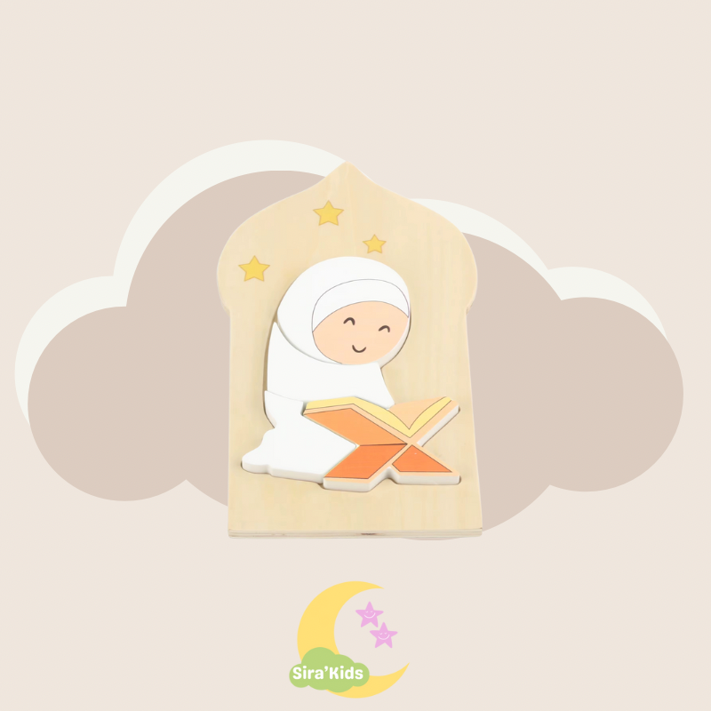 Un lot de deux puzzles en bois éducatifs pour initier les enfants à l’univers islamique : une mosquée majestueuse et une femme lisant le Coran. Idéal pour développer la motricité fine et transmettre des valeurs religieuses avec douceur.
