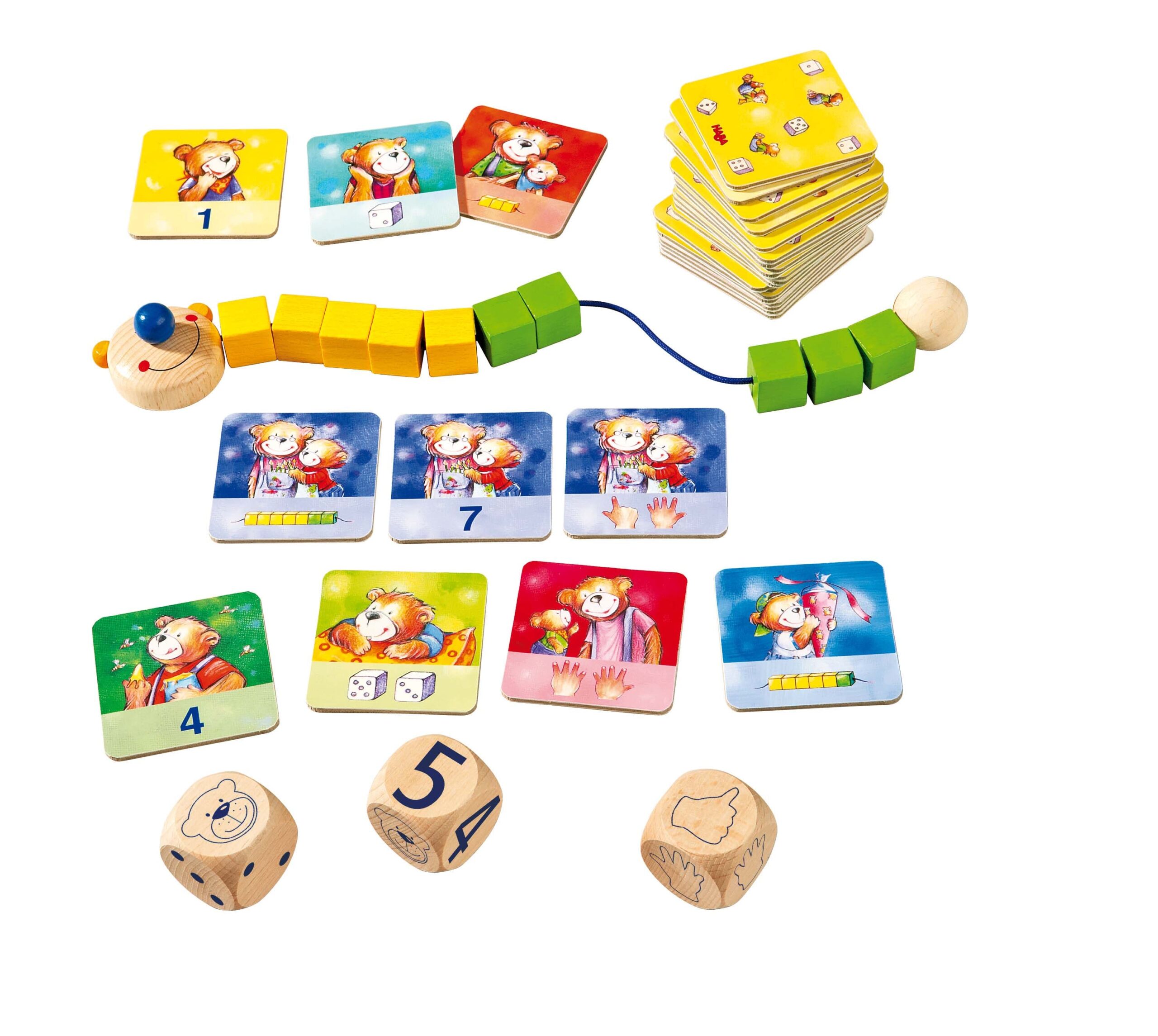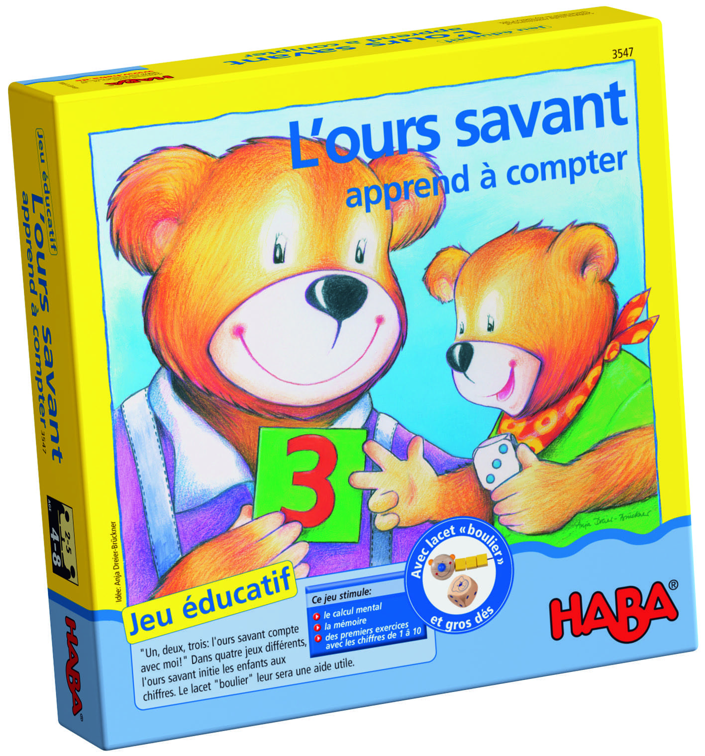 « Un, deux, trois: l’ours savant compte avec moi! » Dans quatre jeux différents, l’ours savant initie les enfants aux chiffres de 1 à 10 et leur apprend à faire des premiers exercices de calcul. Le lacet « boulier » de l’ours savant et les dés à symboles ou chiffres leur seront une aide utile.