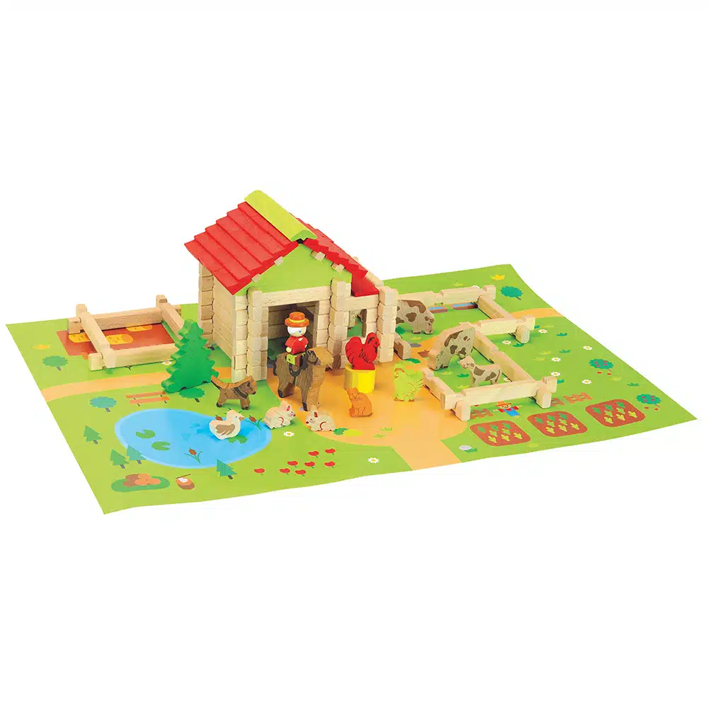 Jeu de construction en hêtre massif de 80 pièces pour réaliser sa ferme en bois et jouer dans les champs avec le personnage et les animaux. Avec un tapis de jeu, une notice de montage facile d’utilisation pour les plus jeunes et une valisette de rangement très pratique.