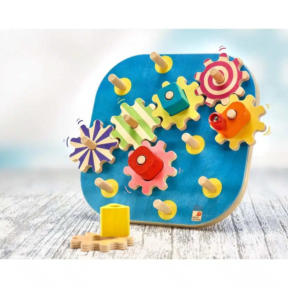 Et que ça roule ! Plus les joueurs placeront de roues dentées les unes avec les autres, plus ça roulera ! Les nombreuses possibilités d’engrenage des formes géométriques multicolores invitent à essayer et à réessayer.
