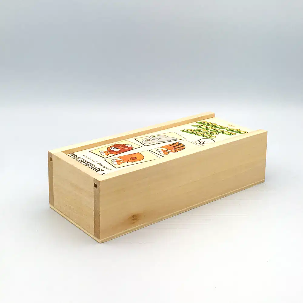24 plaquettes en bois illustrées formant 12 animaux de la savane. En bois de hêtre dans une belle boîte en tilleul avec ouverture coulissante.