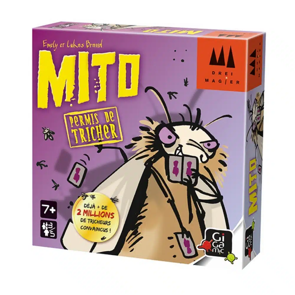 Mito, jeu d’ambiance, le seul jeu où il est permis de tricher ! De la marque Gigamic, à partir de 7 ans, de 3 à 5 joueurs, 25 min de jeu.