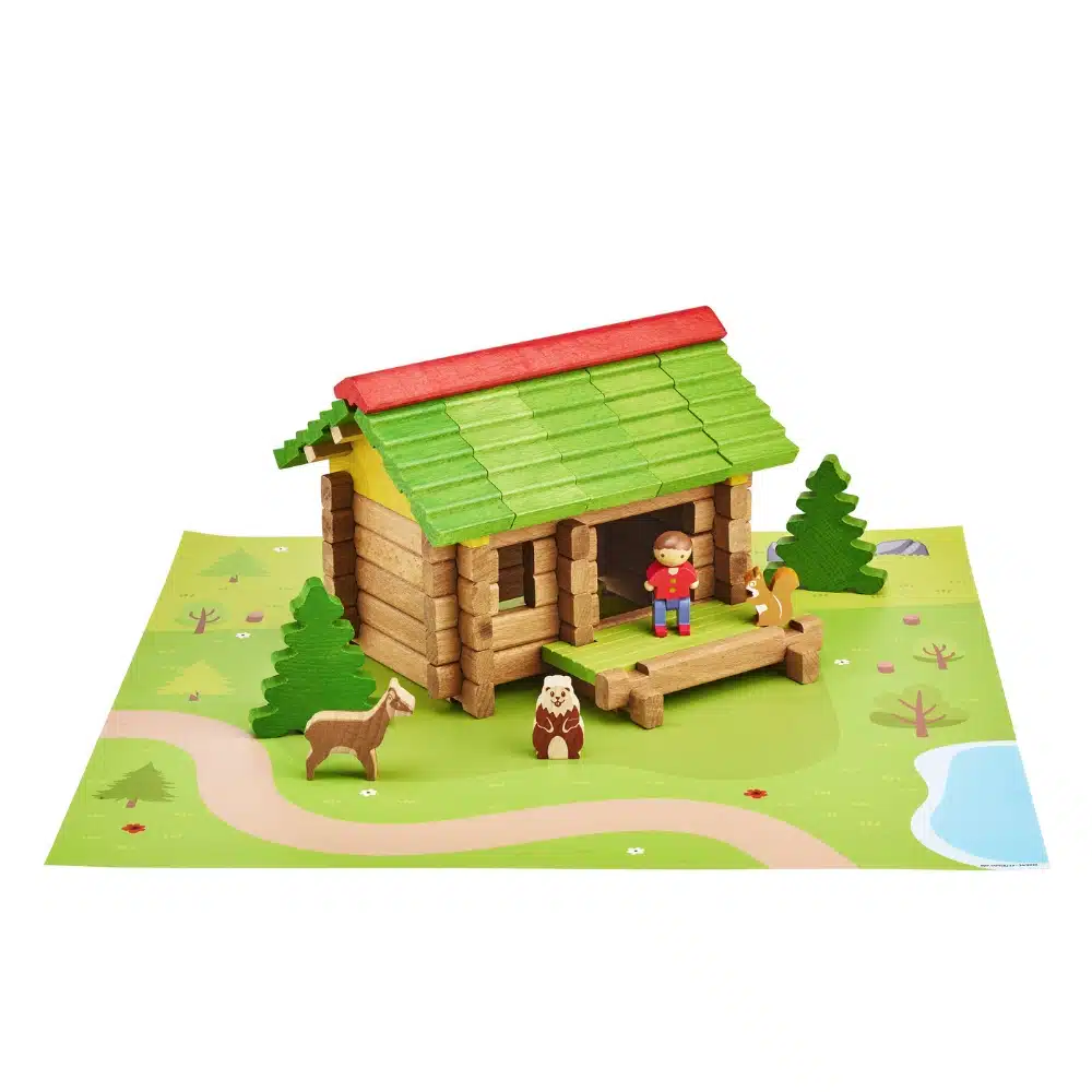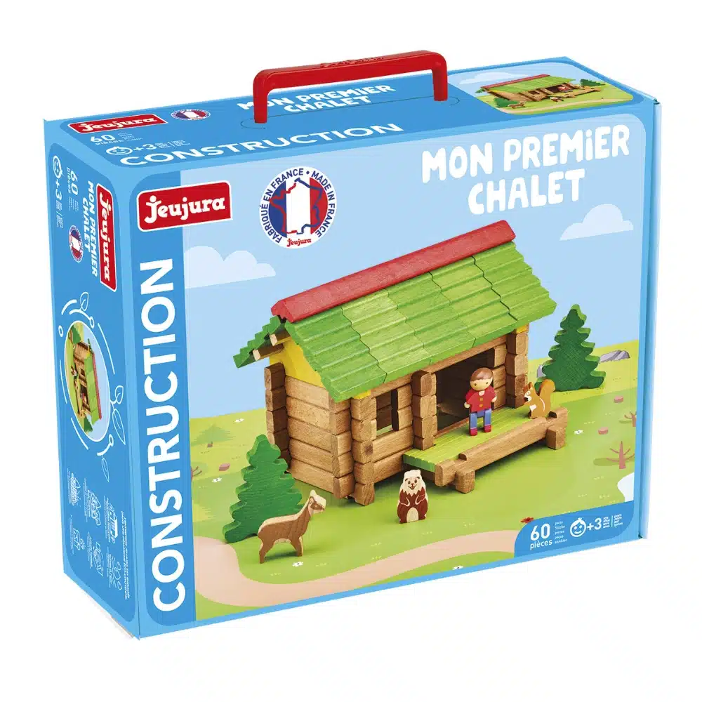 Mon premier chalet en bois 64 pièces, jeu de construction en bois, fabriqué en France par Jeujura. À partir de 3 ans.
