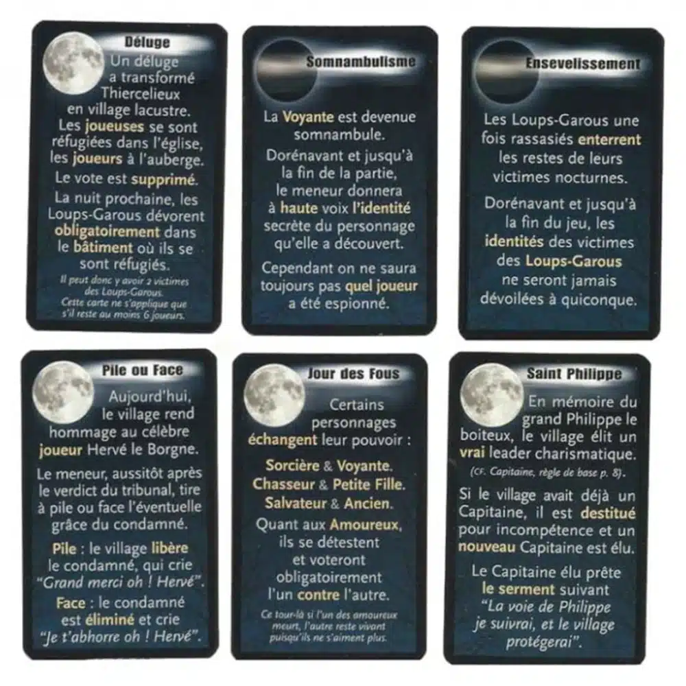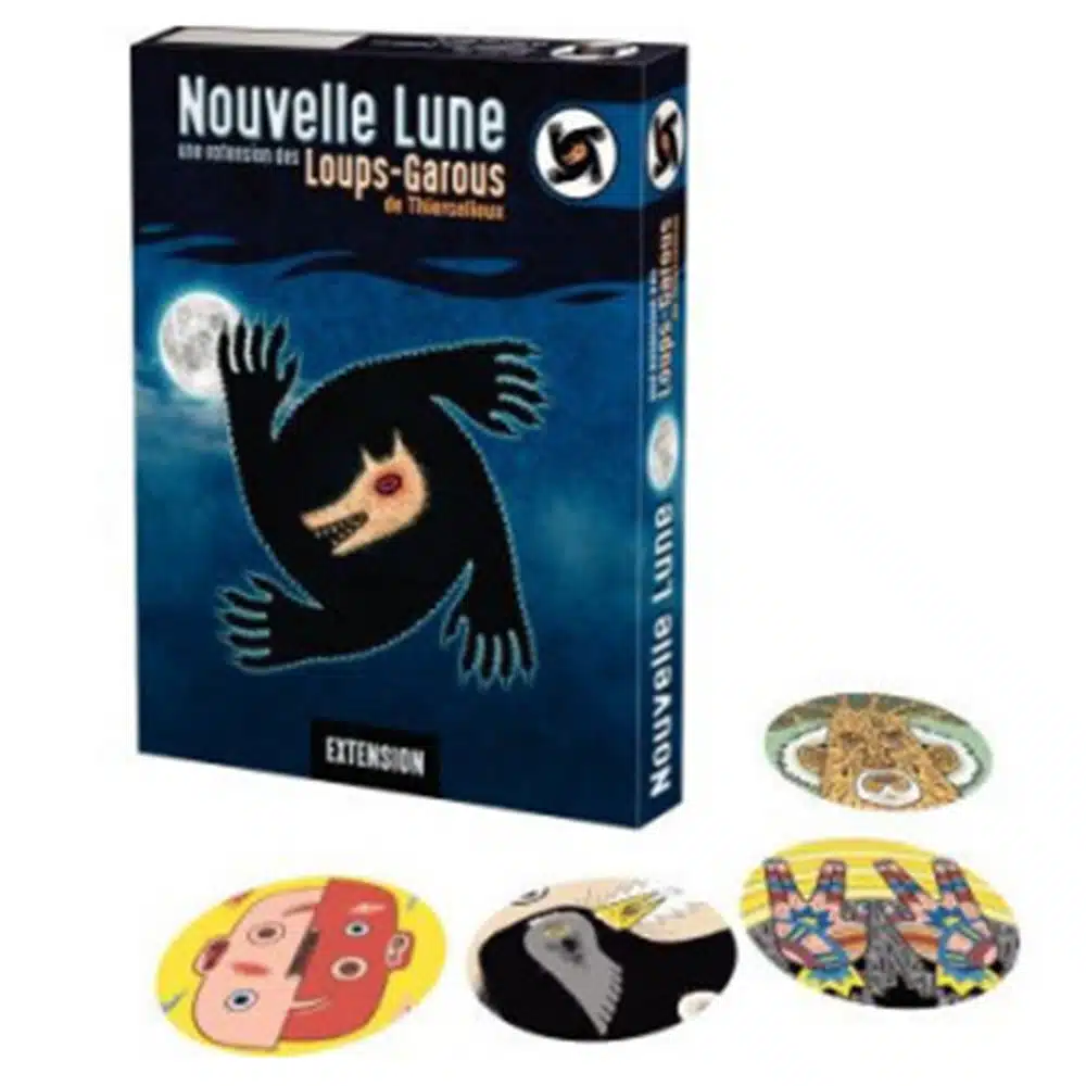 Nouvelle lune, une extension des Loups-Garous de Thiercelieux. Permet de varier le jeu, 36 cartes évènements, 5 nouveaux personnages.