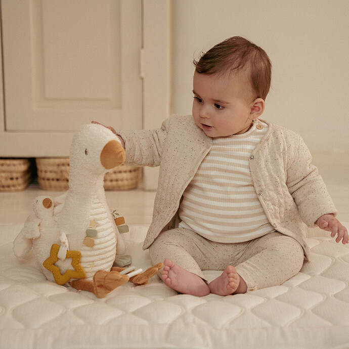 Little Goose est prêt à partir à la découverte ensemble ! Cette oie ludique stimule les sens avec des tissus doux, des sons de cliquetis et des petites étiquettes ludiques. Parfait pour tenir, câliner et stimuler la motricité fine. Grâce à son format pratique, il est facile à saisir par de petites mains.