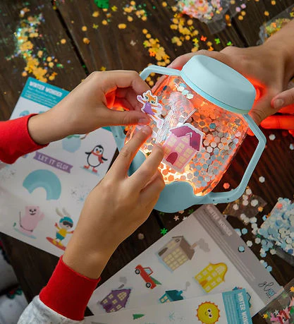 La lumière change entre neuf couleurs différentes d’une simple pression sur le couvercle. Enfin, le bocal sensoriel peut être décoré avec des autocollants amusants et réutilisables.