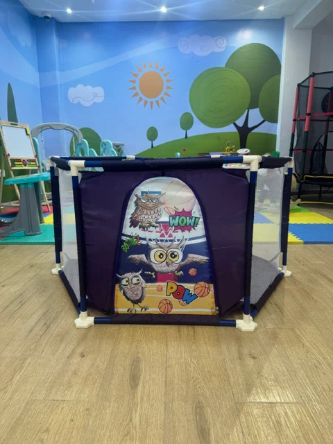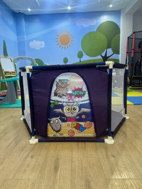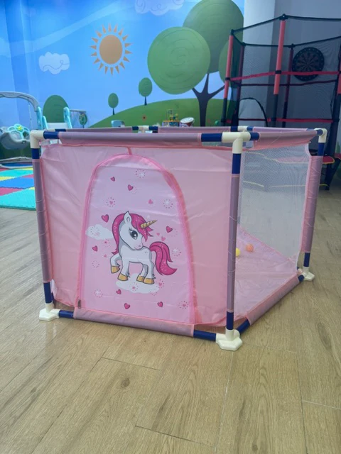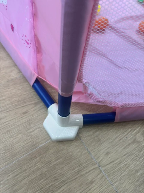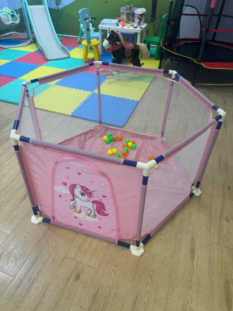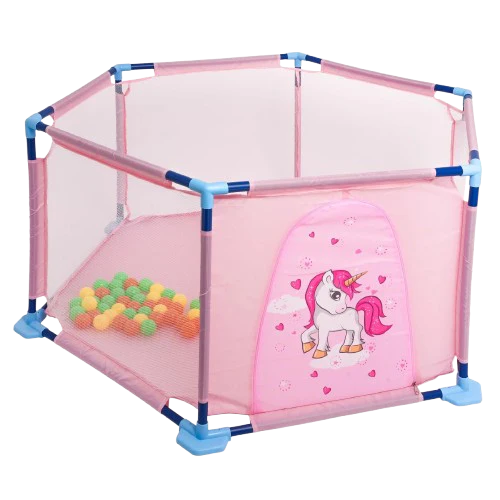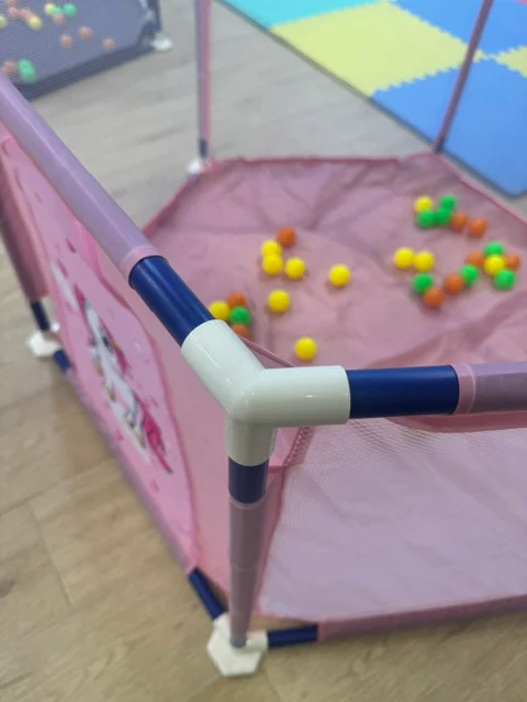 Cinq murs du parc sont en grillage, ce qui permet de surveiller l’enfant pendant qu’il joue. Un mur est doté d’une fermeture éclair pour une entrée et une sortie faciles. Le parc est livré avec 40 balles colorées.