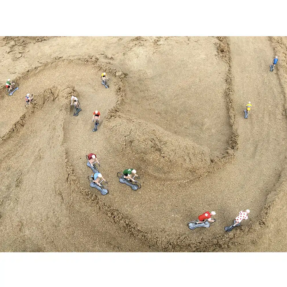 Replongez à l’époque des petits cyclistes en plomb ! Utilisé depuis des générations sur la plage: modelez le sable afin de créer un circuit, chacun votre tour, lancez une bille dans le parcours, positionner votre petit cycliste où la bille s’est arrêtée pour marquer votre position. Quel petit cycliste va remporter la course ?