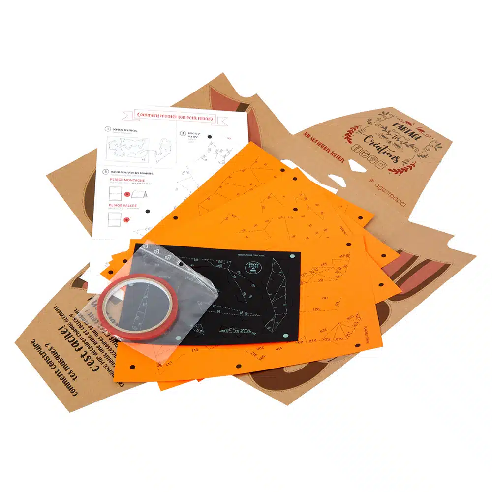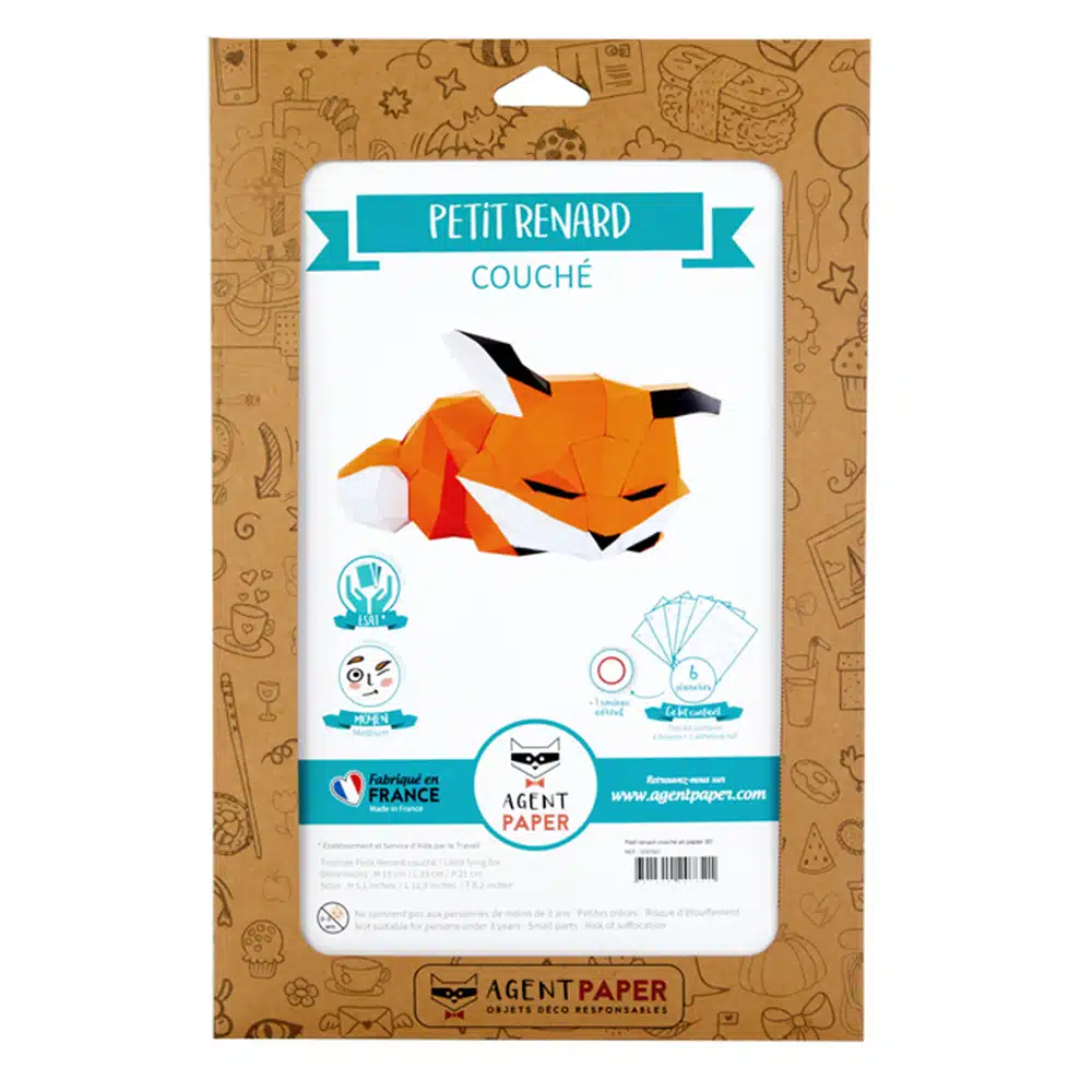 Kit de décoration à poser en papier 100% recyclé fabriqué en France. Le kit comprend des planches de pièces pré-découpées, une notice et du scotch double face, tout y est pour construire ce joli petit renard couché.