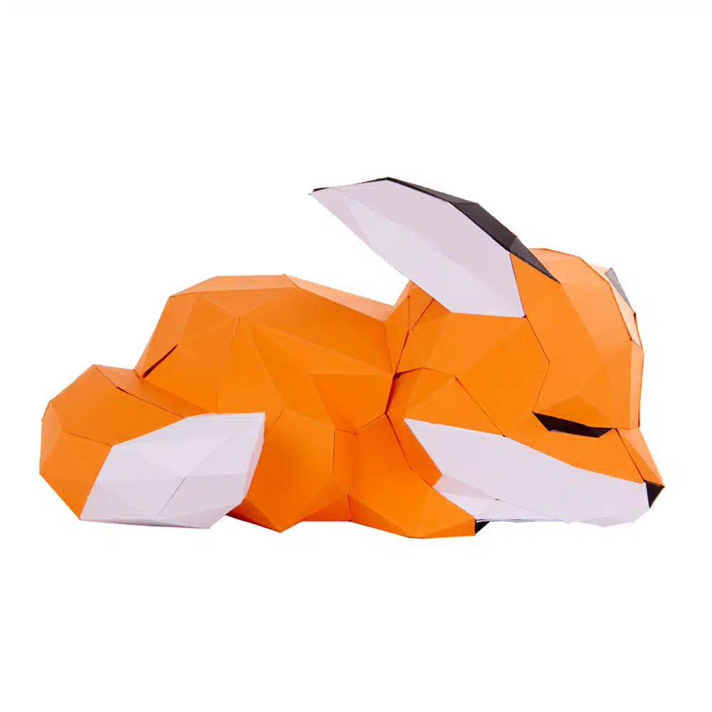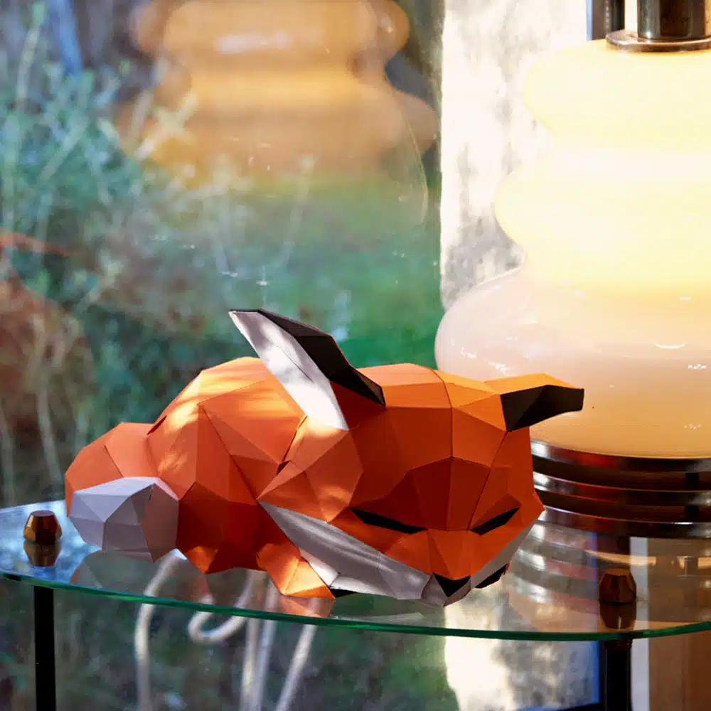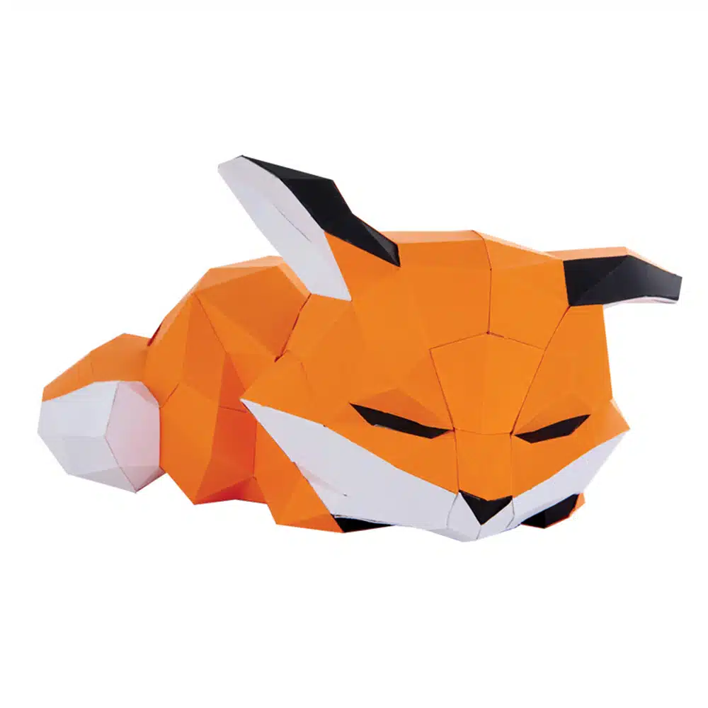 Trophée en papier 3D Petit renard couché, décoration originale à poser 100% fabrication française et éco-responsable de la marque Agent-Paper, à monter soi-même niveau moyen.