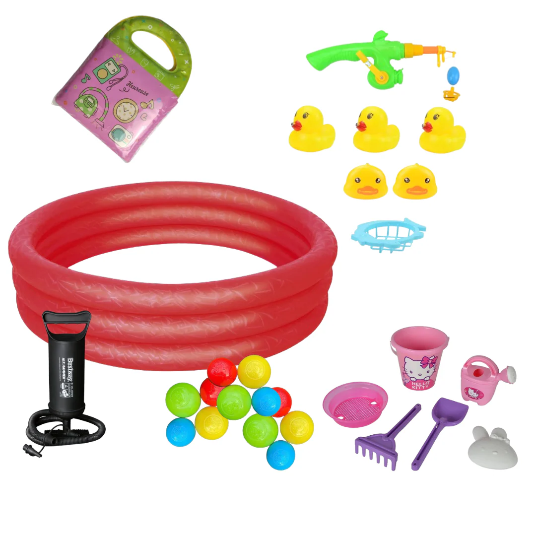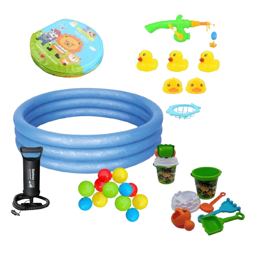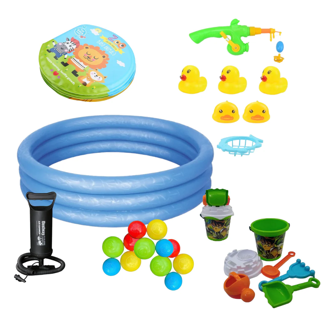 Piscine ronde 1.22 m x 25 cm : Pompe : Livre de bain : Canne a pêche : 10 balles colorées : Set de plage offert :