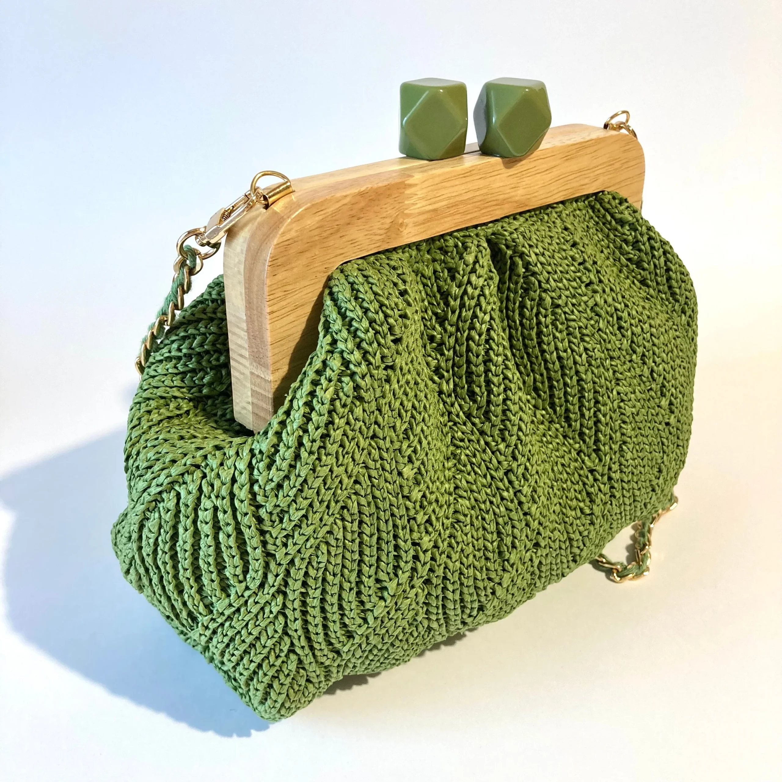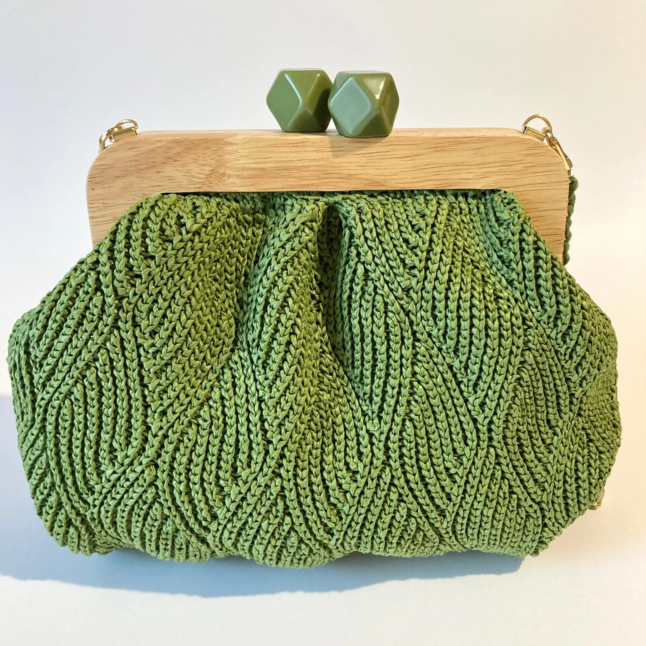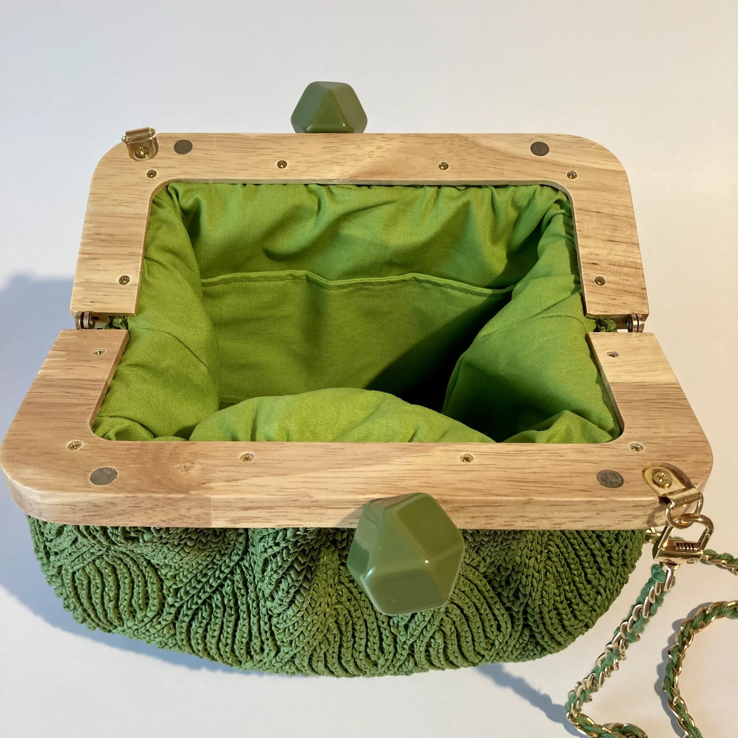 Dotée d’un fermoir en bois raffiné et d’une anse ajustable, cette pochette polyvalente se transforme aisément en un sac bandoulière chic.