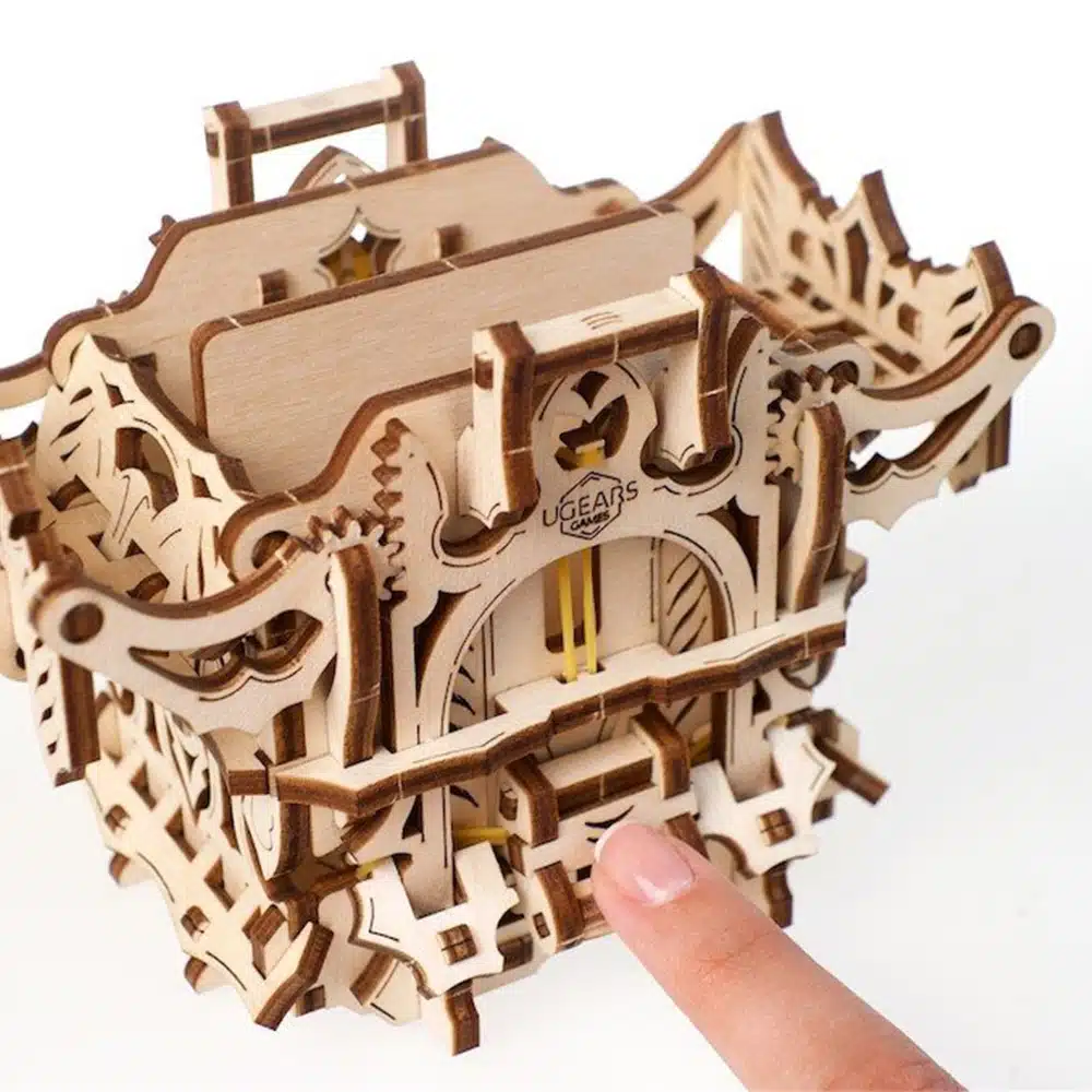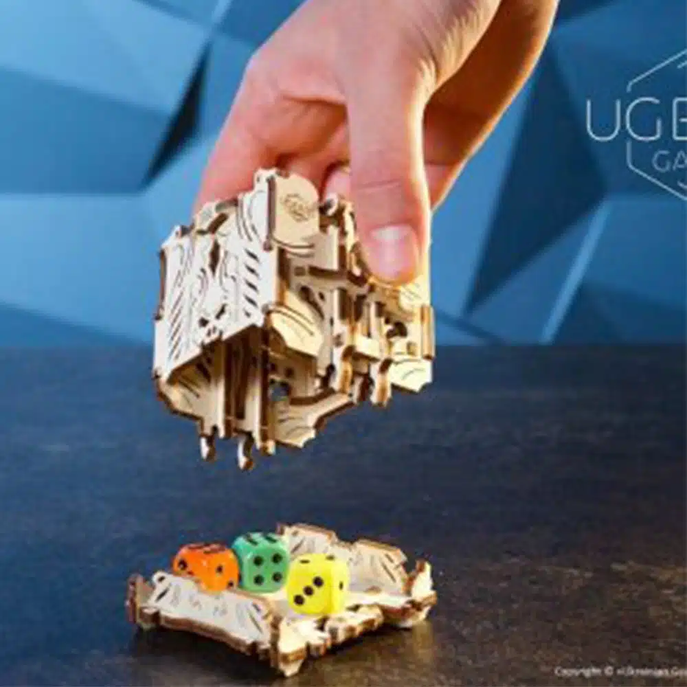 Le modèle est composé de quatre caissons. Individuellement, les compartiments à dés peuvent servir un quatuor de joueurs dans leur quête. Plus besoin de chercher un dé ou de ramper sous la table à sa recherche (ça arrive aux meilleurs d’entre nous). Placez simplement vos dés dans un des caissons et secouez-le bien. Remettez-le sur la table et appuyez simultanément sur les boutons sur les côtés. Cela libérera le fond de la boîte ainsi que les dés qui y étaient emprisonnés. À présent il est temps de passer à l’action!