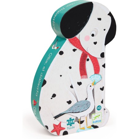 Ollie, le dalmatien part passer la journée à la plage avec ses parents. Ce puzzle coloré de 24 pièces est présenté dans une jolie boîte silhouette en forme de chien.