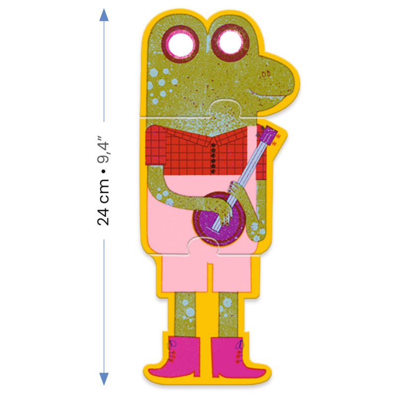 Contenu: 24 pièces: 8 puzzles verticaux de 3 pièces (1 grenouille qui joue du banjo, 1 caniche violoncelliste, 1 lapin jouant du triangle, 1 chien saxophoniste, 1 chat qui joue du mélodica, 1 tigre joueur de flûte, 1 hibou avec son harmonica et 1 chat avec son kazoo)