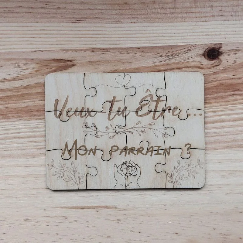 Offrez une demande inoubliable avec ce puzzle en bois « Veux-tu ĂȘtre mon parrain ? ». FabriquĂ© avec soin Ă partir de bois de qualitĂ©, chaque piĂšce de ce puzzle rĂ©vĂšle votre message spĂ©cial, transformant votre cadeau en un souvenir mĂ©morable. IdĂ©al pour toucher le cĆur du futur parrain de maniĂšre originale et Ă©mouvante. Un cadeau parfait pour marquer cette occasion spĂ©ciale avec Ă©lĂ©gance et personnalitĂ©.