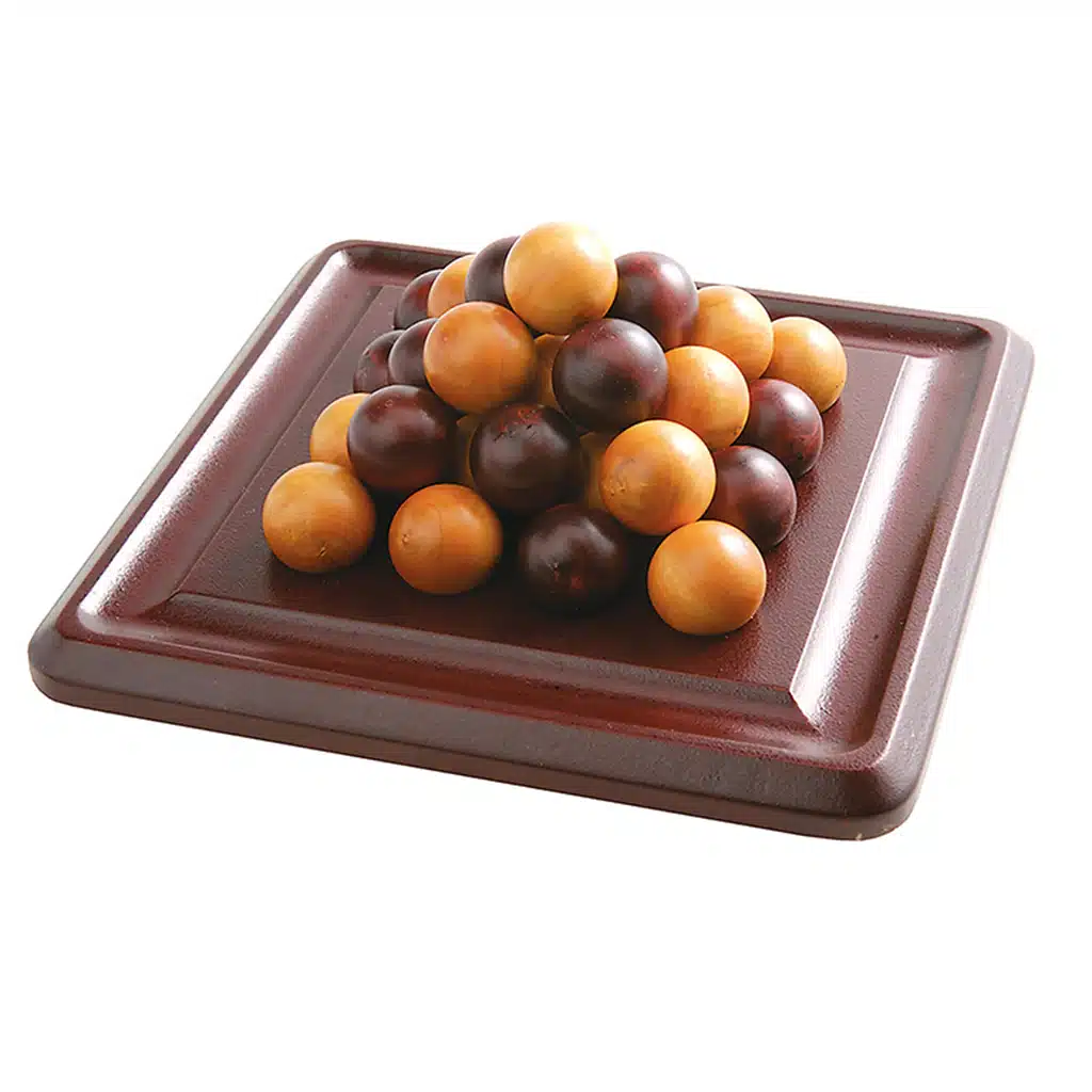 Les deux joueurs reçoivent chacun 15 billes qu’ils doivent disposer tour à tour sur le plateau, en forme de pyramide. Deux principes simples permettent d’économiser des billes: