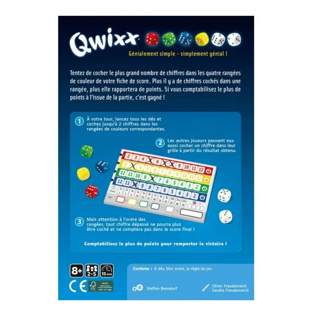 Avec Qwixx, impossible de s’ennuyer : à son tour, chaque joueur lance les dés et tout le monde peut utiliser le résultat pour cocher un chiffre d’une de ses rangées. Plus vous cochez de cases, plus vous marquez de points. Mais attention, les chiffres sont classés dans un certain ordre et une fois que vous en avez passé impossible de revenir en arrière. Laissez-vous emporter par la simplicité de ce jeu de dés palpitant !