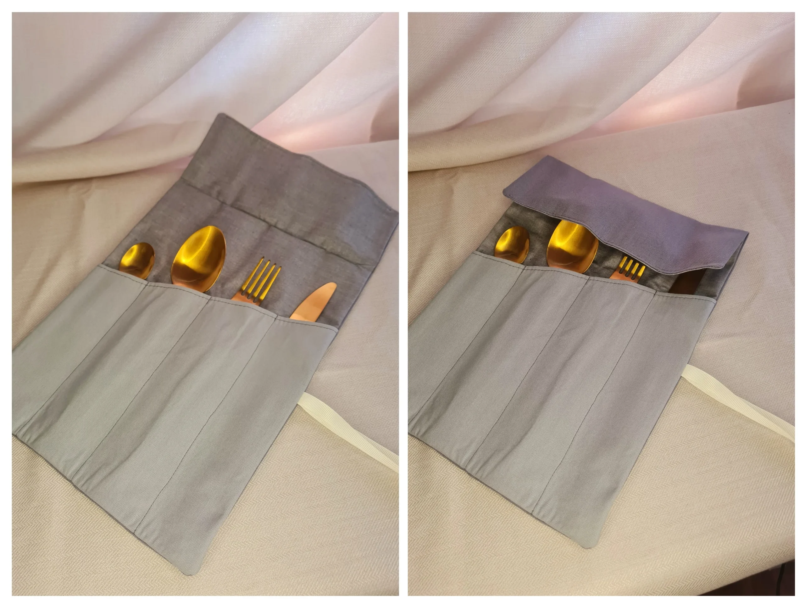 Il est molletonné afin d’éviter que les dents des ustensiles ne percent le tissu. Et à l’intérieur il est recouvert d’un tissu enduit, ce qui le rend très facile à nettoyer !!