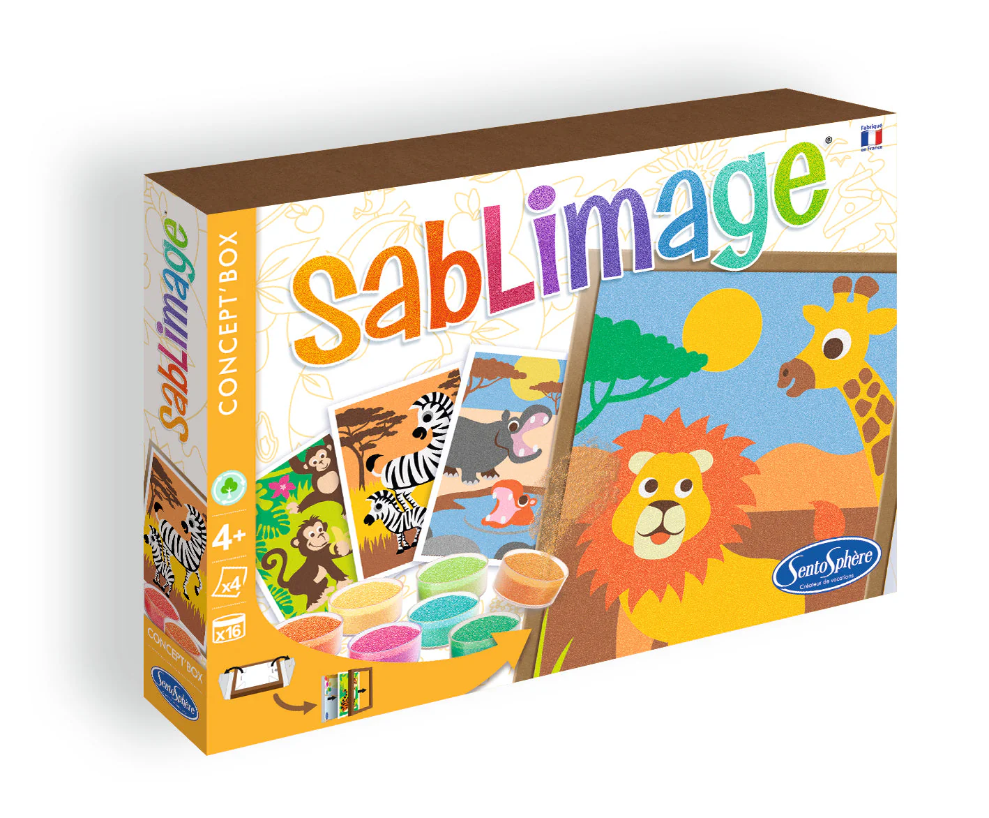 Lions, girafes, zèbres, hippopotames… bienvenue dans la savane africaine ! 15 nuances de sable coloré, 4 tableaux prédécoupés et préencollés et c’est parti pour des heures d’activité ludique !