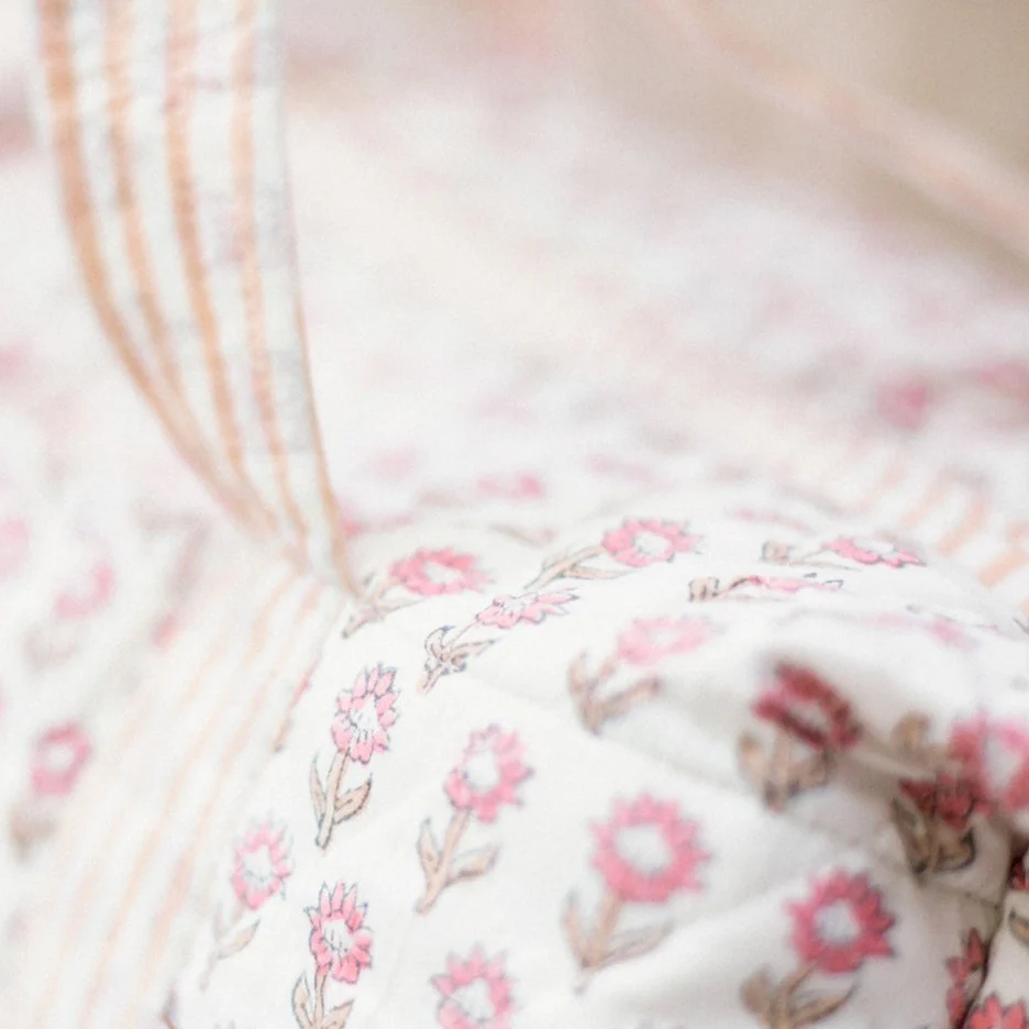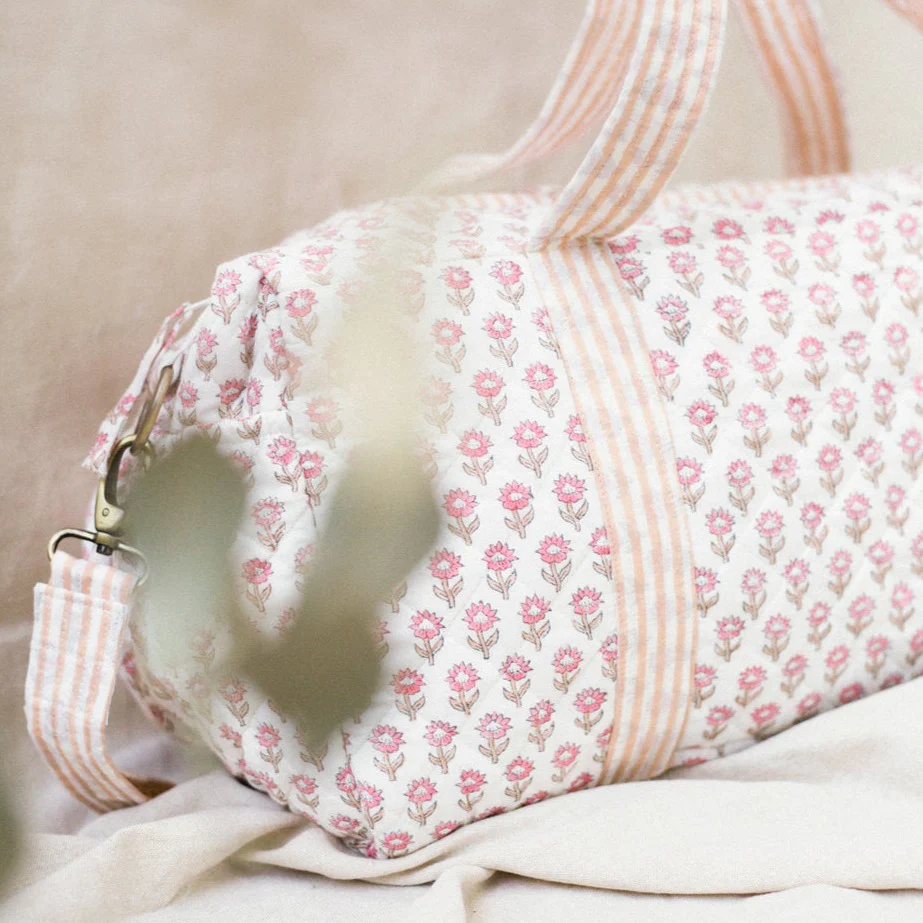 Ce joli sac à langer Oeillet d’Inde Rose a la particularité de ne pas ressembler à un sac à langer.