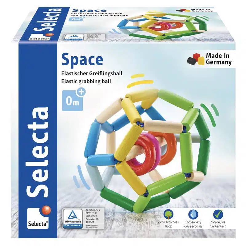 Space, le hochet balle en bois élastique, à saisir, remuer, presser, faire rouler, fera le bonheur de bébé, de la marque Selecta, fabriqué en Allemagne à partir de 0 an.