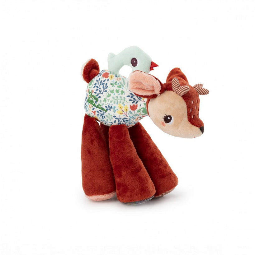Stella, le faon, étire ses pattes pour le plus grand plaisir des petites oreilles. Crépitement, hochet, tintement… et quand on appuie sur son ventre, le petit oiseau gazouille.