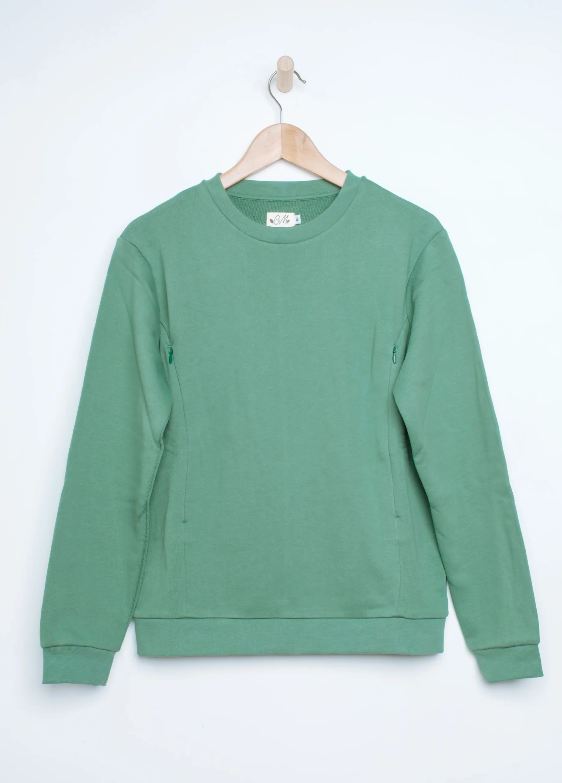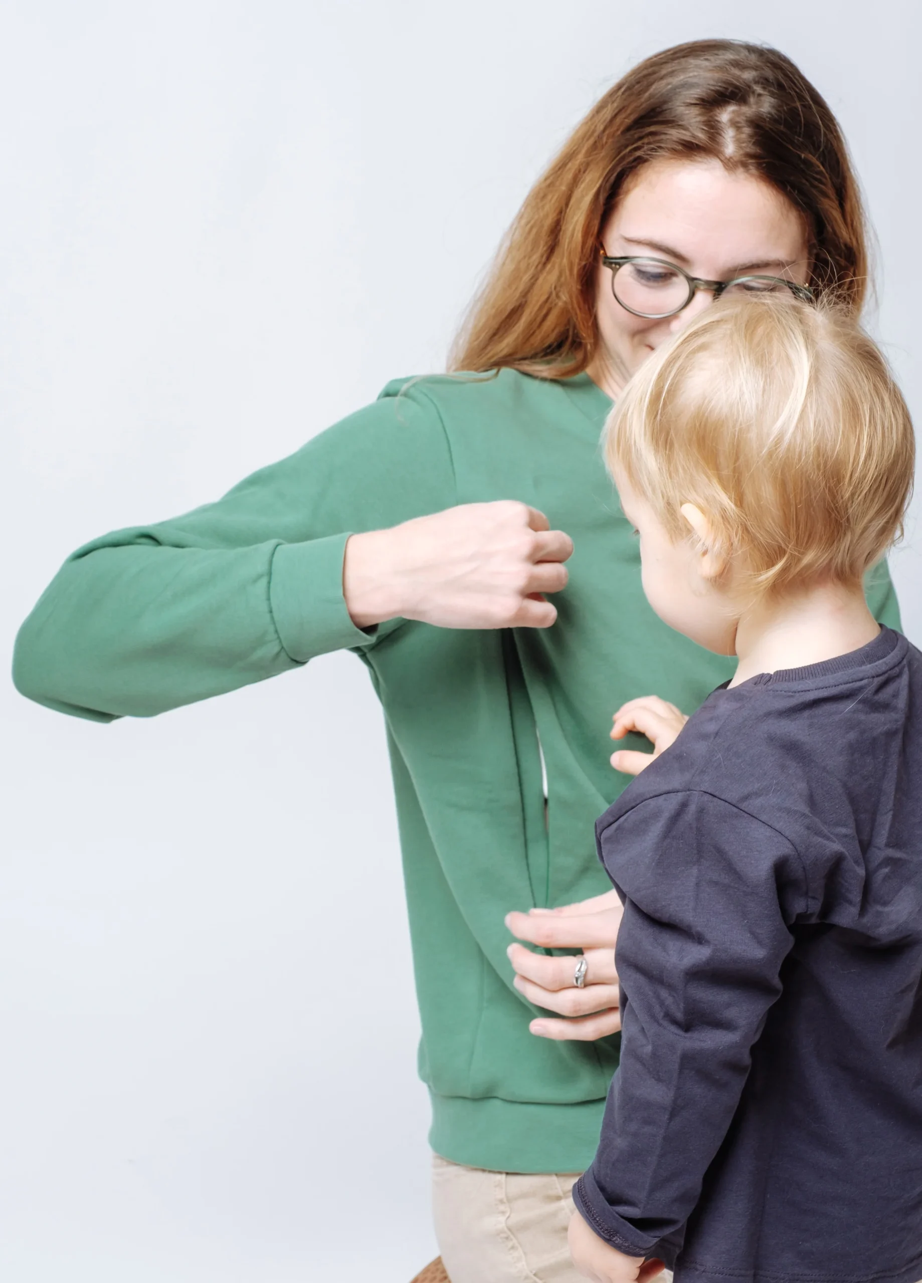 - Le pull d’allaitement « Macha » possède deux ouvertures zip verticales à l’extérieur de la poitrine pour faciliter l’allaitement.