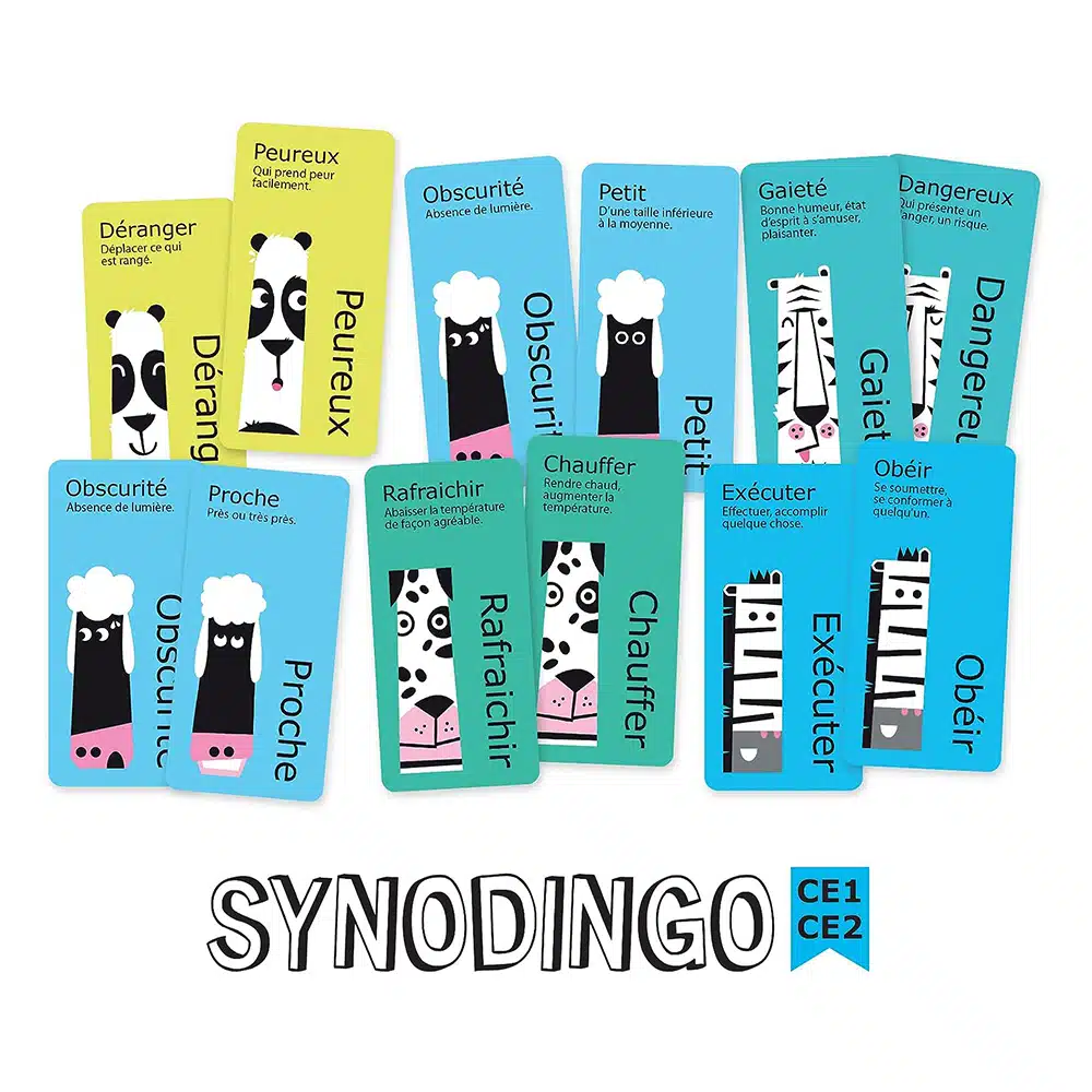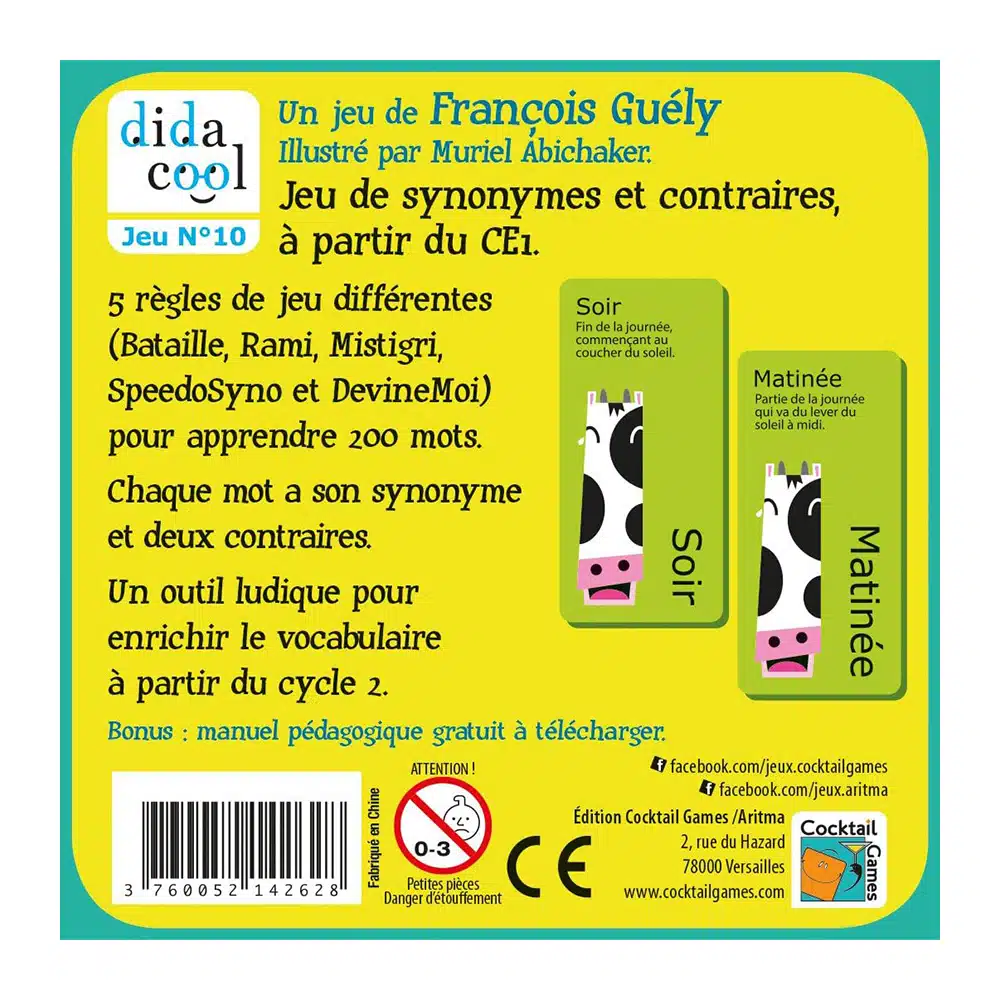 5 règles de jeu différentes (Bataille, Rami, Mistigri, SpeedoSyno et DevineMoi) pour apprendre 200 mots. Chaque mot à son synonyme et deux contraires. À partir de 7 ans, de 2 à 8 joueurs, niveau CE1 CE2.