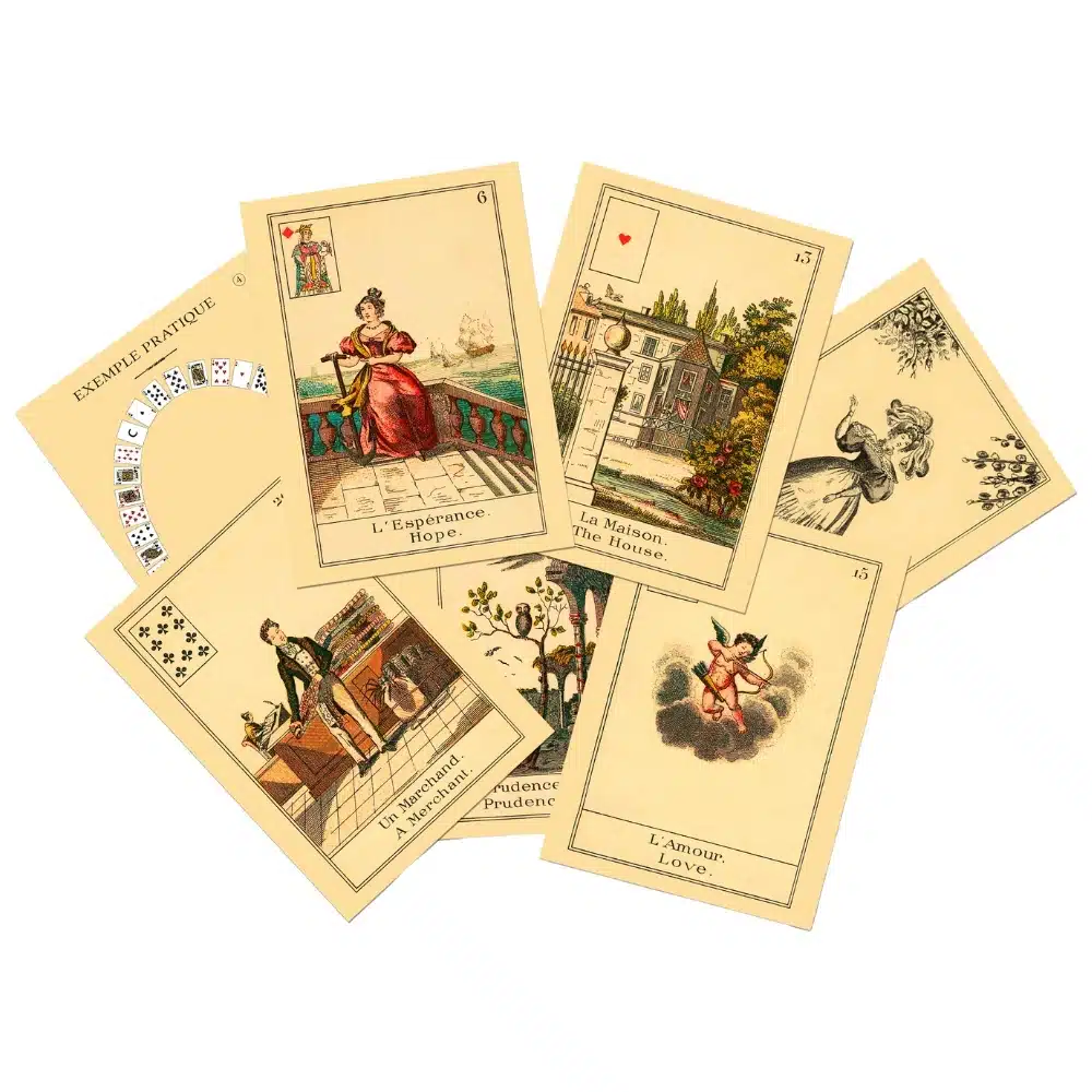 Cette jolie boîte contient 33 cartes et une méthode de divination. La cartomancie, ou l’art de tirer les cartes est un mode de divination très ancien mais toujours considéré comme une passe-temps agréable aujourd’hui. Il existe de multiples manières de tirer les cartes, ici une méthode simple est proposée grâce à une liste contenant la signification des cartes de ce jeu et un exemple pratique. N’oubliez pas que l’interprétation des cartes reste un amusement et non une science exacte.