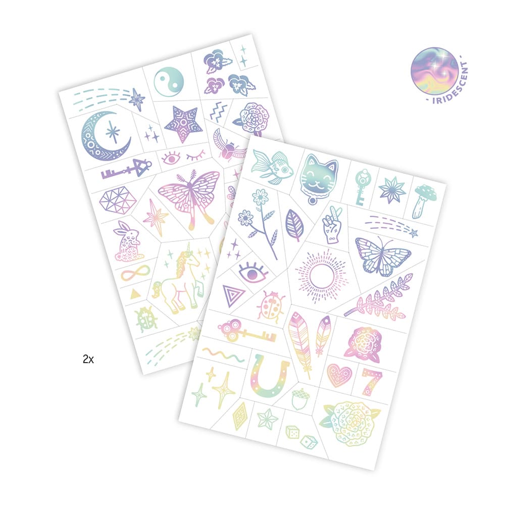 Une planche de tatouages éphémères se compose de différents motifs sur le thème des licornes, attrape-rêves. Ces tatouages éphémères enfant sont un accessoire de déguisement indispensable lors d’un anniversaire ou pour une fête d’école. Découpez le tatouage choisi, enlevez le film, puis placez-le sur la partie du corps à tatouer, passez de l’eau sur le papier et le tour est joué ! Vous obtenez un superbe tatoo Djeco.