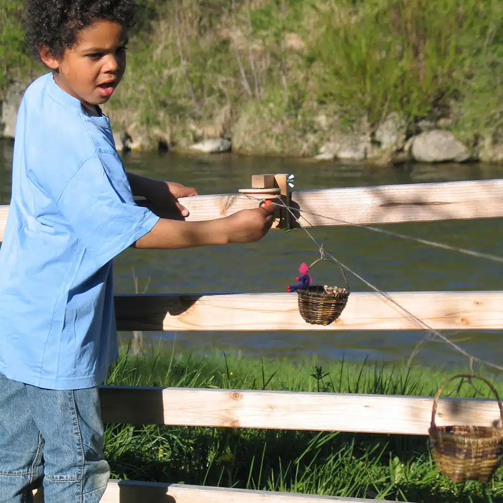 Le mini funiculaire à petits paniers marche aussi bien dehors que dedans. Les paniers relient les deux stations en boucle fermée, comme un télésiège, transportant éléments de construction et petits personnages. Le câble porteur contourne les poulies de renvoie comme dans un télésiège. Les 2 serre-joints fournis se fixent à un rebord de table, d’étagère ou bien à une branche. Montage dès 9 ans, jeu dès 4 ans. Les petits personnages en feutrine ne sont pas compris dans la boîte.