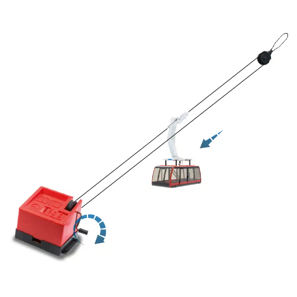 Ce kit contient un système de va et vient à manivelle, poulie de renvoie, un câble en coton et une benne rouge. Les portes de la cabine s’ouvrent.