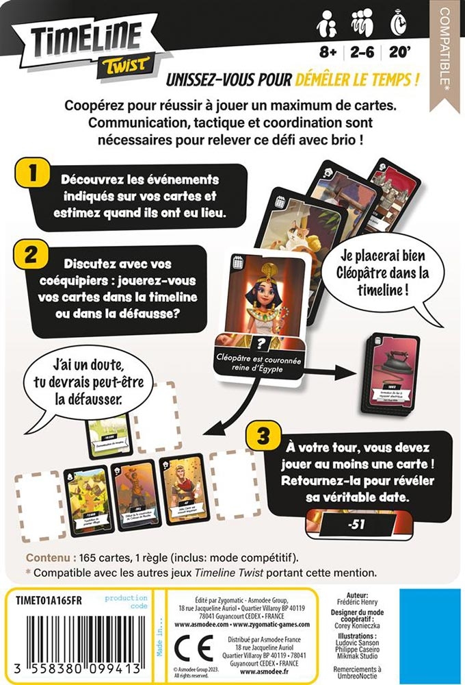Une nouvelle version de Timeline avec des règles coopératives Nouveau format de cartes, plus grandes Jouer avec l’histoire sans la connaître Contenu 165 cartes, règles.
