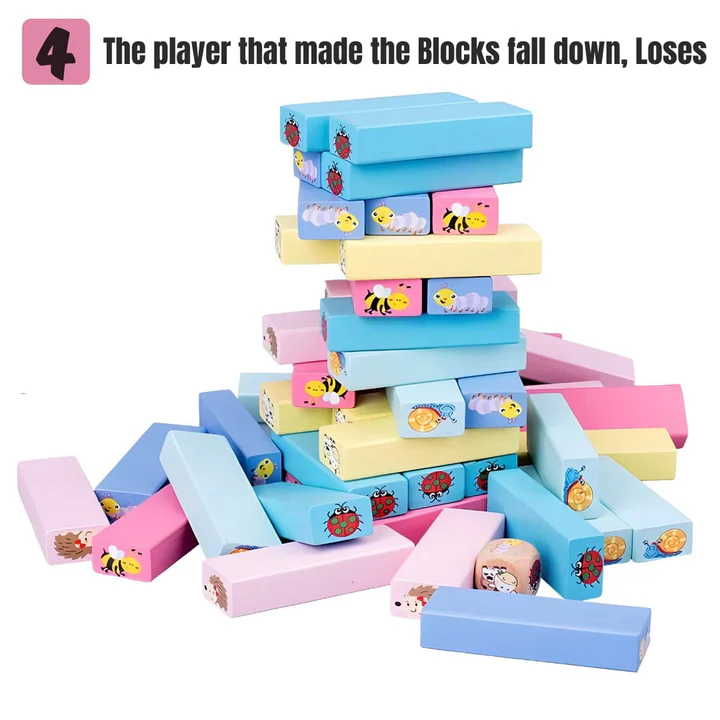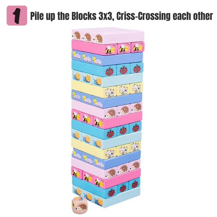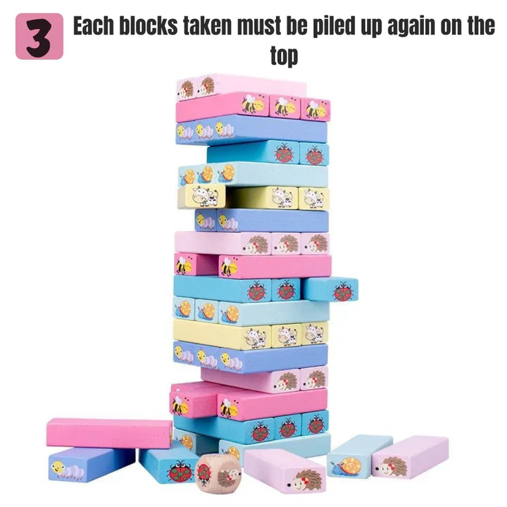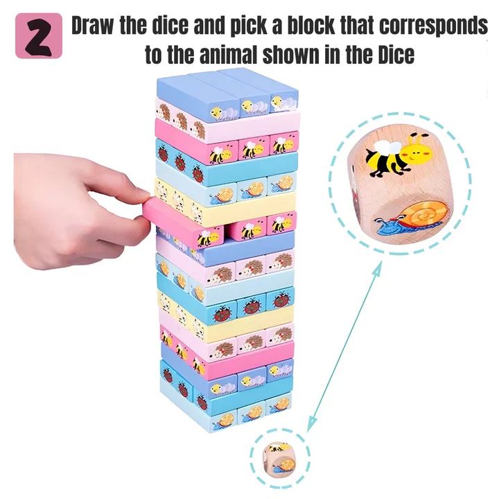 Jeu de société amusant où le but est de retirer les blocs, en fonction de l’animal désigné par le dé, un à un pour les reposer au sommet de la tour sans la faire tomber ! Le dernier joueur qui réussit à déposer le bloc en haut de la tour sans la faire tomber gagne la partie !