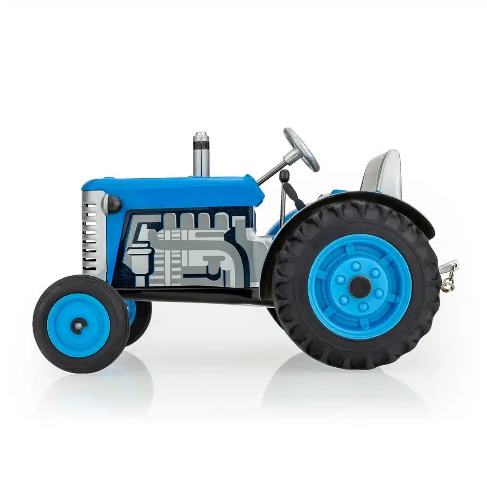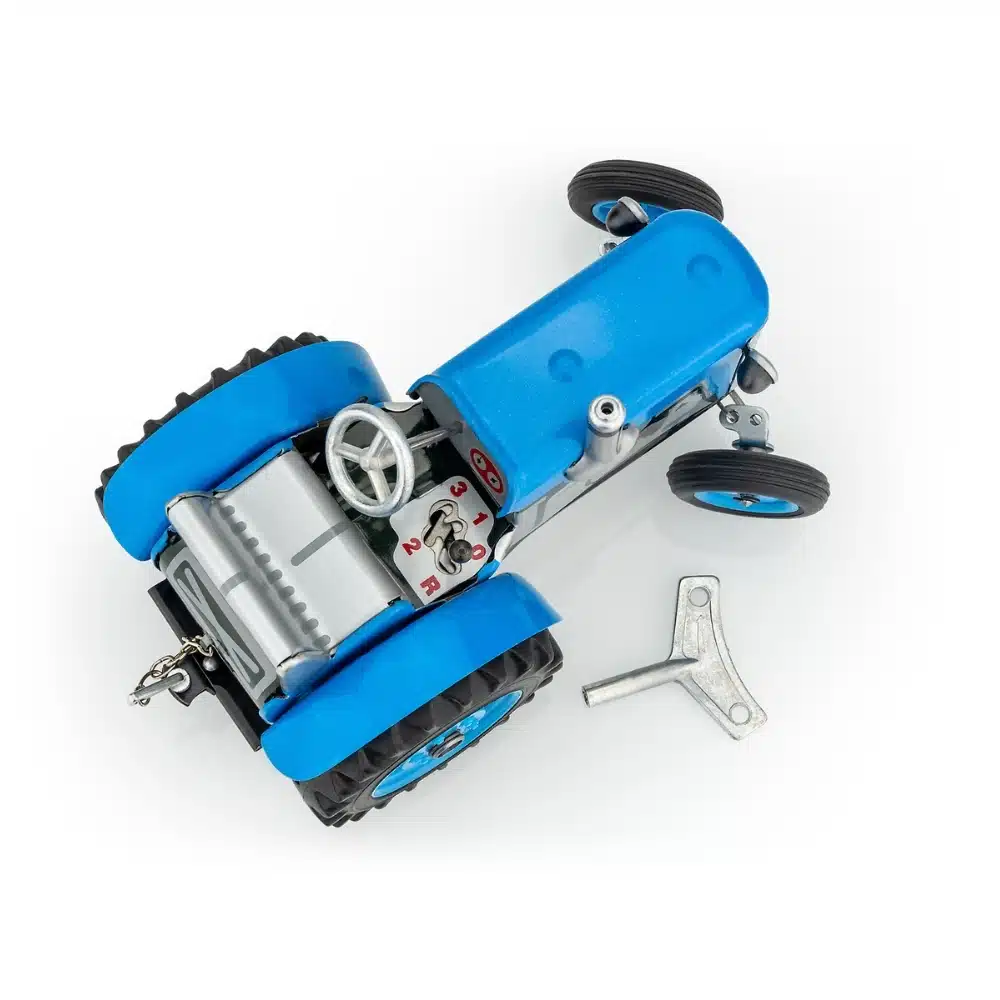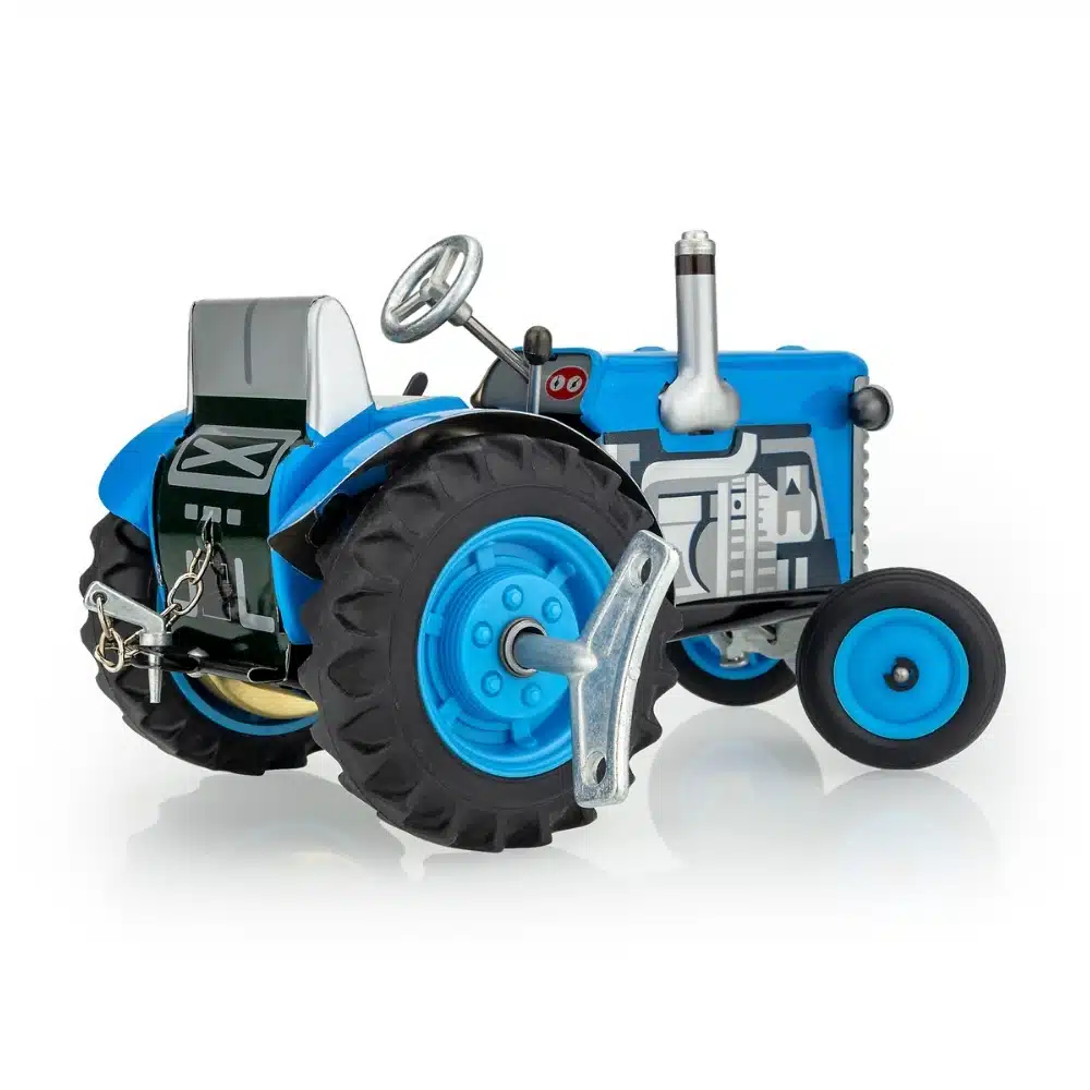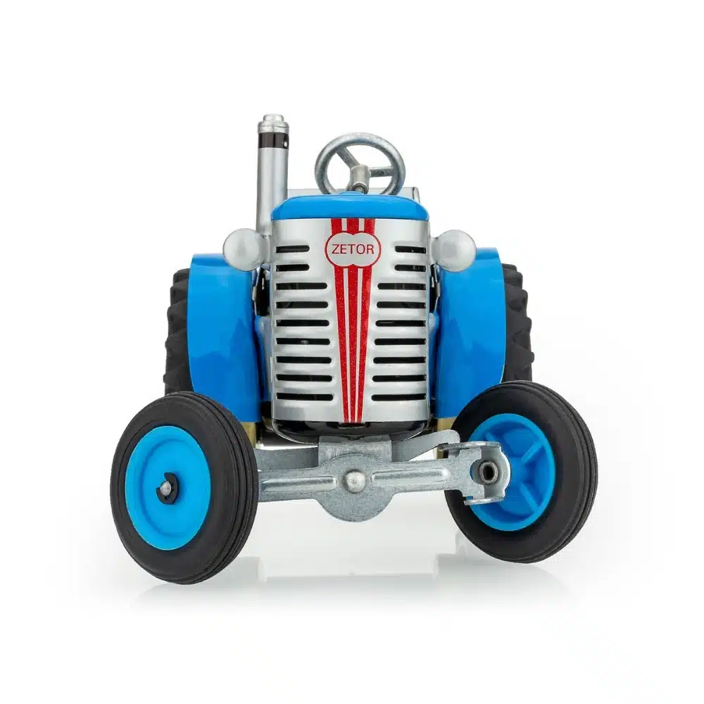 Tracteur mécanique en tôle emboutie et jantes en plastique, représentant un Zetor bleu, pourvu de 3 vitesses, un point mort et une marche arrière.
