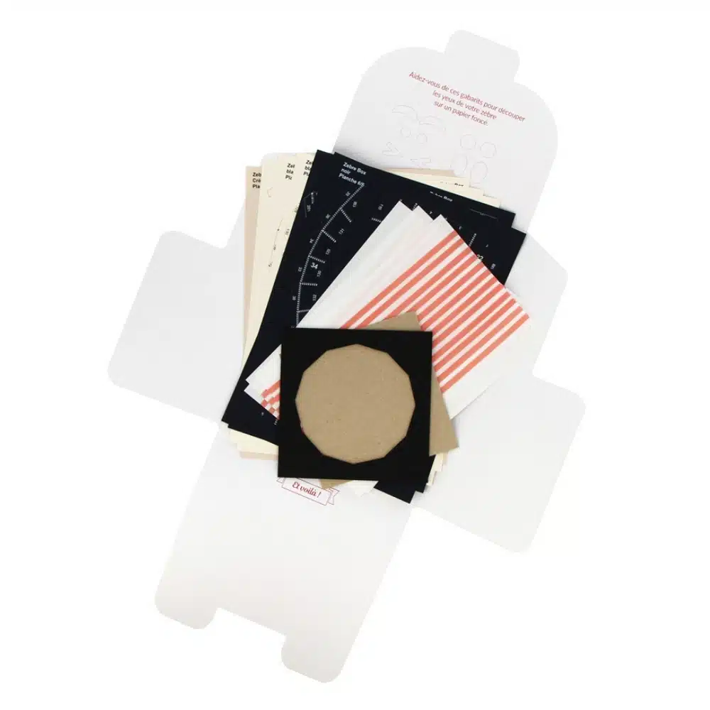 Kit de décoration à poser en papier 100% recyclé fabriqué en France. Le kit comprend des planches de pièces pré-découpées, une notice et du scotch double face, tout y est pour construire ce joli petit zèbre. Il peut être posé sur une étagère tel quel ou servir de couvercle pour une boîte surprise.