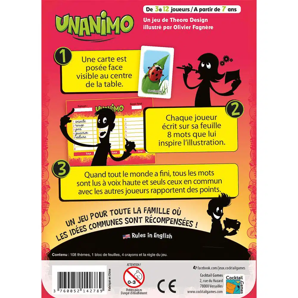 Jeu d’ambiance et d’associations, édition Cocktail Games. À partir de 7 ans, 3 à 12 joueurs. Durée d’une partie 30 minutes.