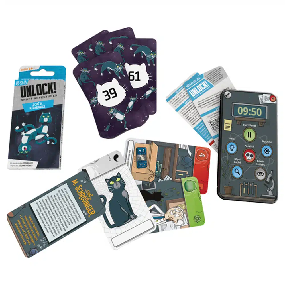 Unlock ! Short Adventures – Le chat de M. Schrödinger. Jeu de cartes coopératif, d’enquêtes pour animer vos soirées entre amis ou en famille.