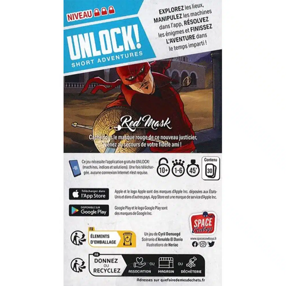 Unlock ! Short Adventures – Red mask. Jeu de cartes coopératif, d’enquêtes pour animer vos soirées entre amis ou en famille.